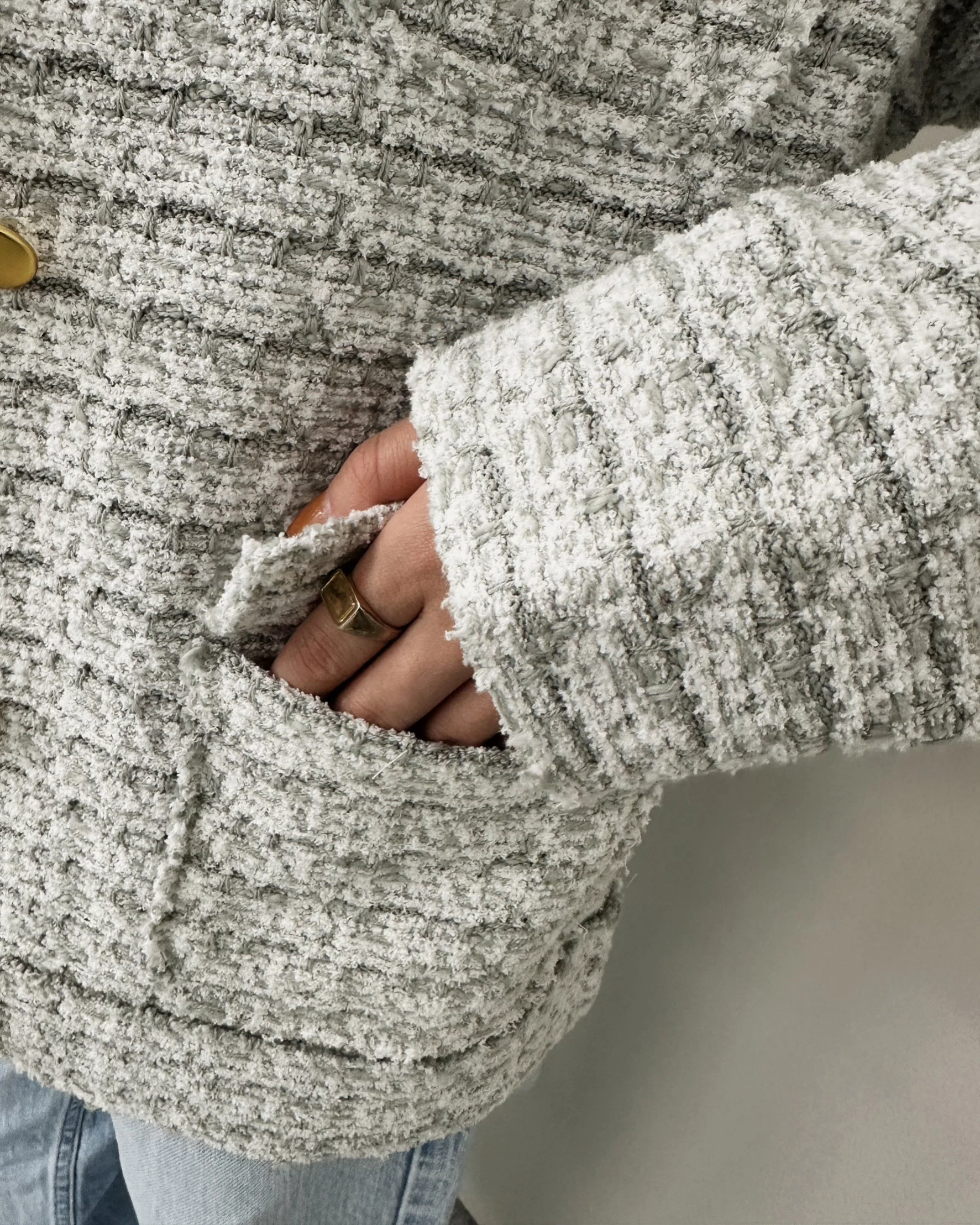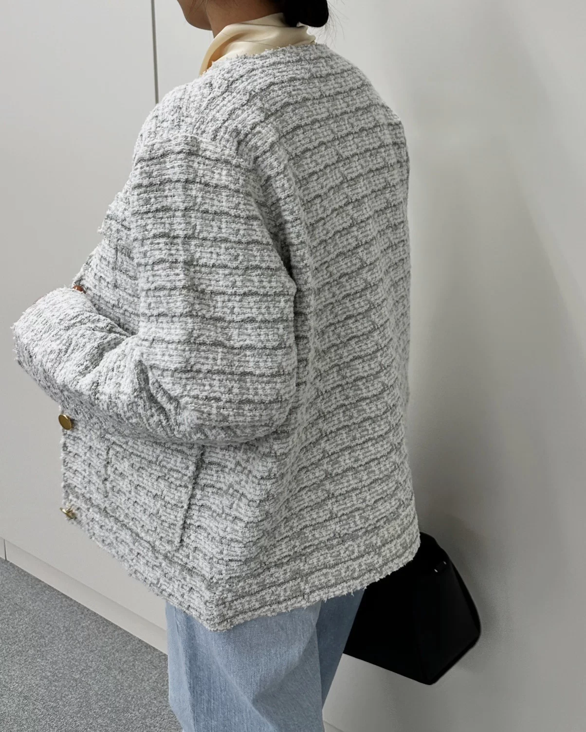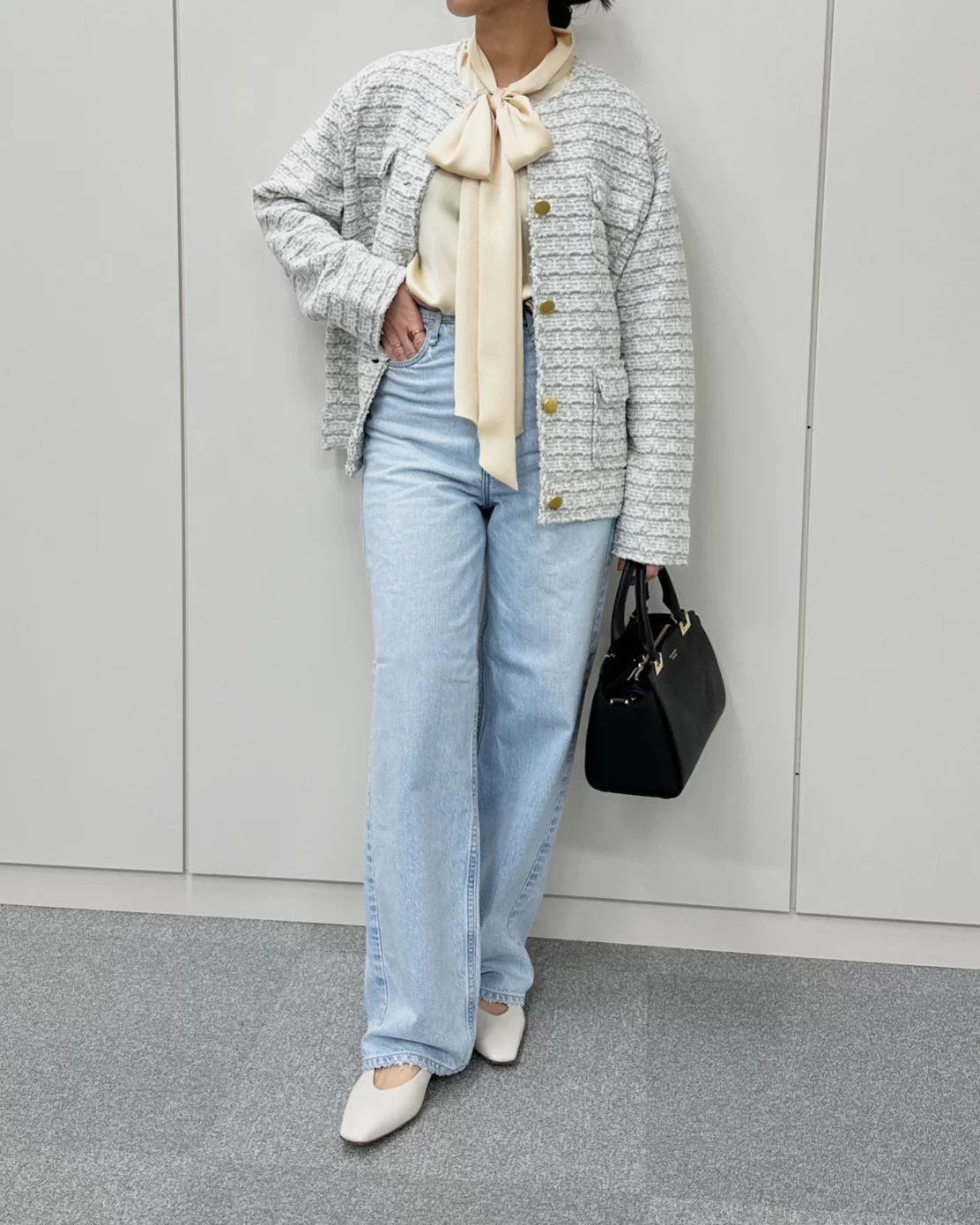 きちんと感をキープしながら、ニット素材なのでさっと気軽にはおれてカジュアルにも合わせやすいのが魅力。新色のライトグレーは、ボーダーのような柄が入っているのもアクセントに。ノーカラーなのでボウタイブラウスとのレイヤードもおすすめです。