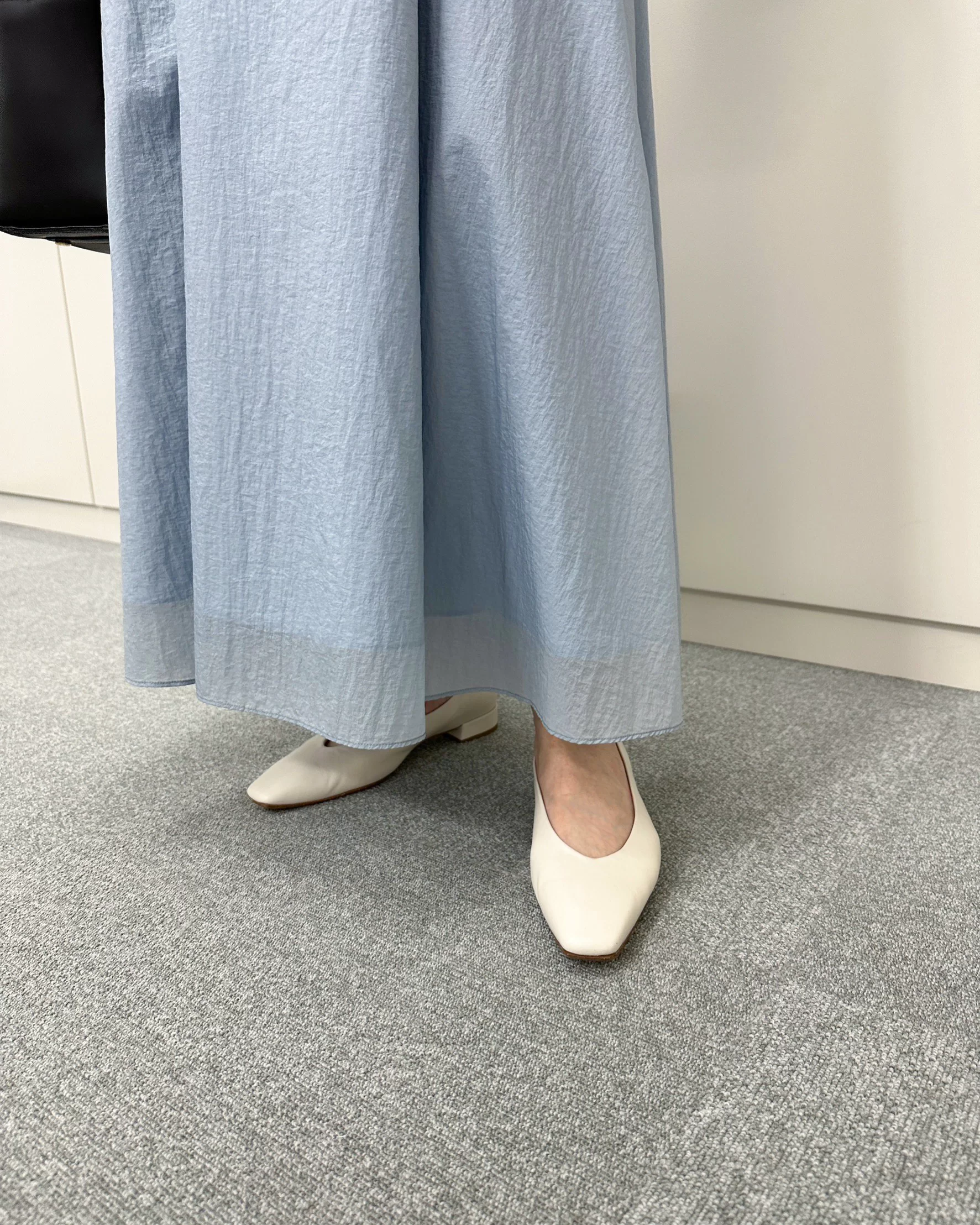 軽やかなナイロン素材を女性らしいフレア型に落とし込んだ一枚は、カジュアルからエレガントまで幅広い着こなしにマッチ。ギャザーを後ろに多く入れることで立体的なボリュームシルエットが完成し、下半身をすっきりカバー。