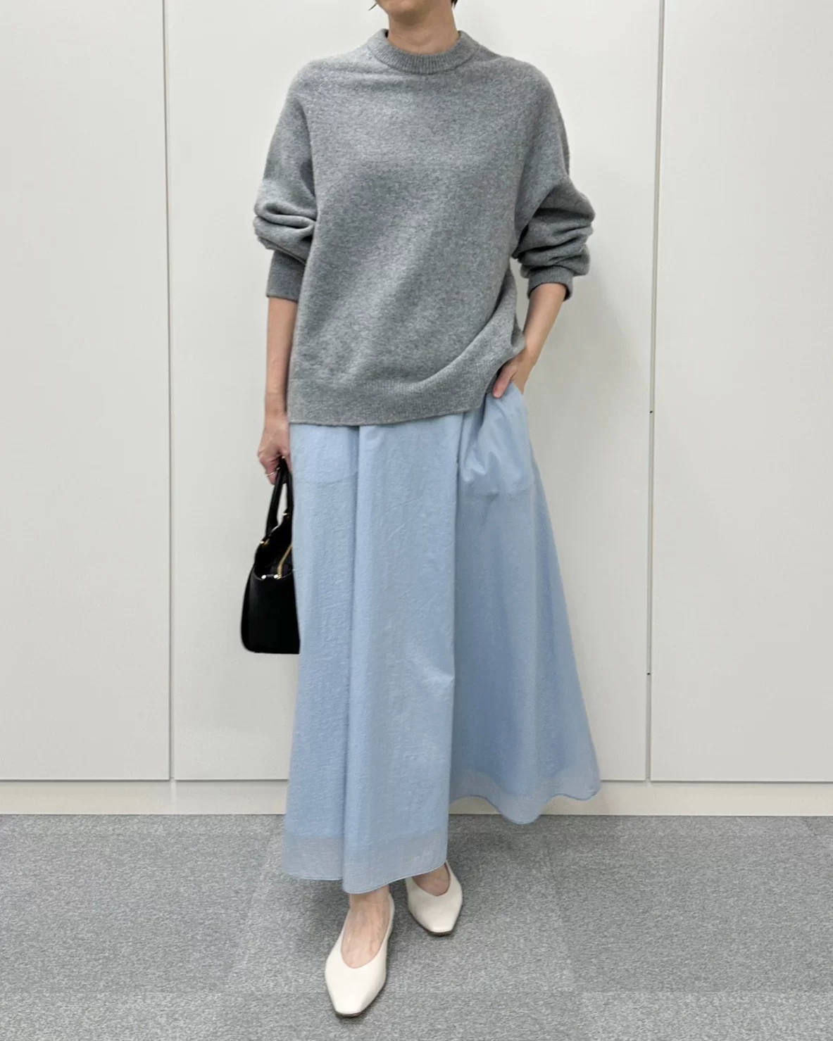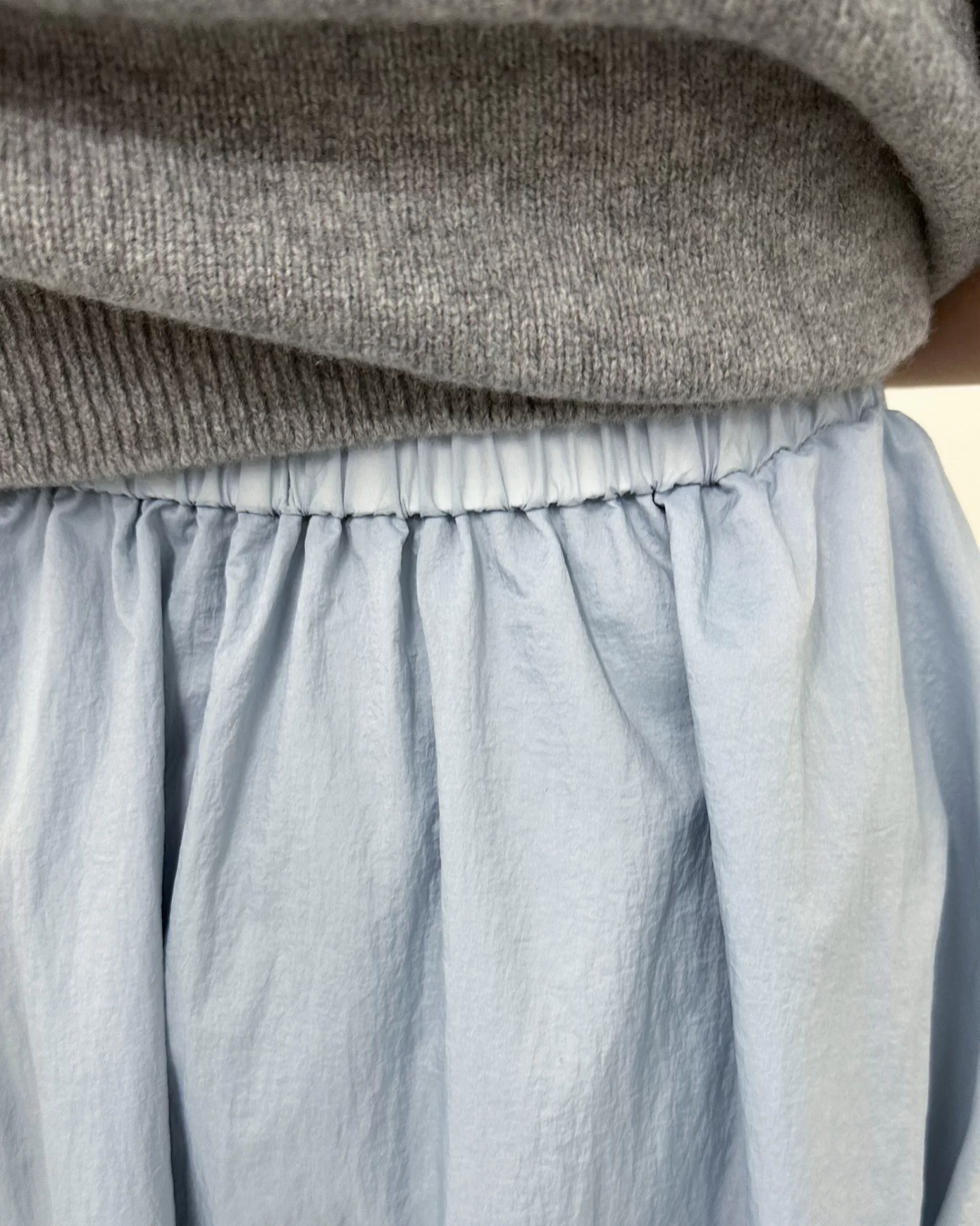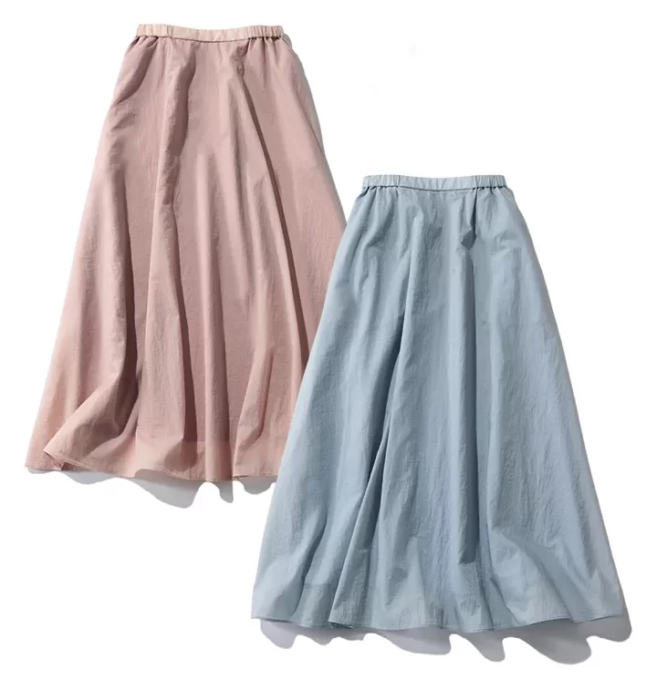 シンプルな冬ニットにも映える、パステルブルーのスカート。ほんのり甘さのあるカラーでも、シャカシャカとしたスポーティーな素材感と、長めの着丈が大人っぽい印象です。ウエストはゴムで着心地も楽ちん。春はスウェットやカットソーに、夏はTシャツに合わせて長いシーズン着回しを楽しめます。