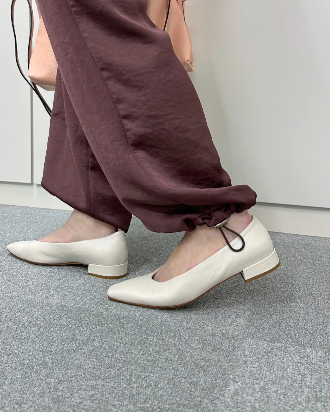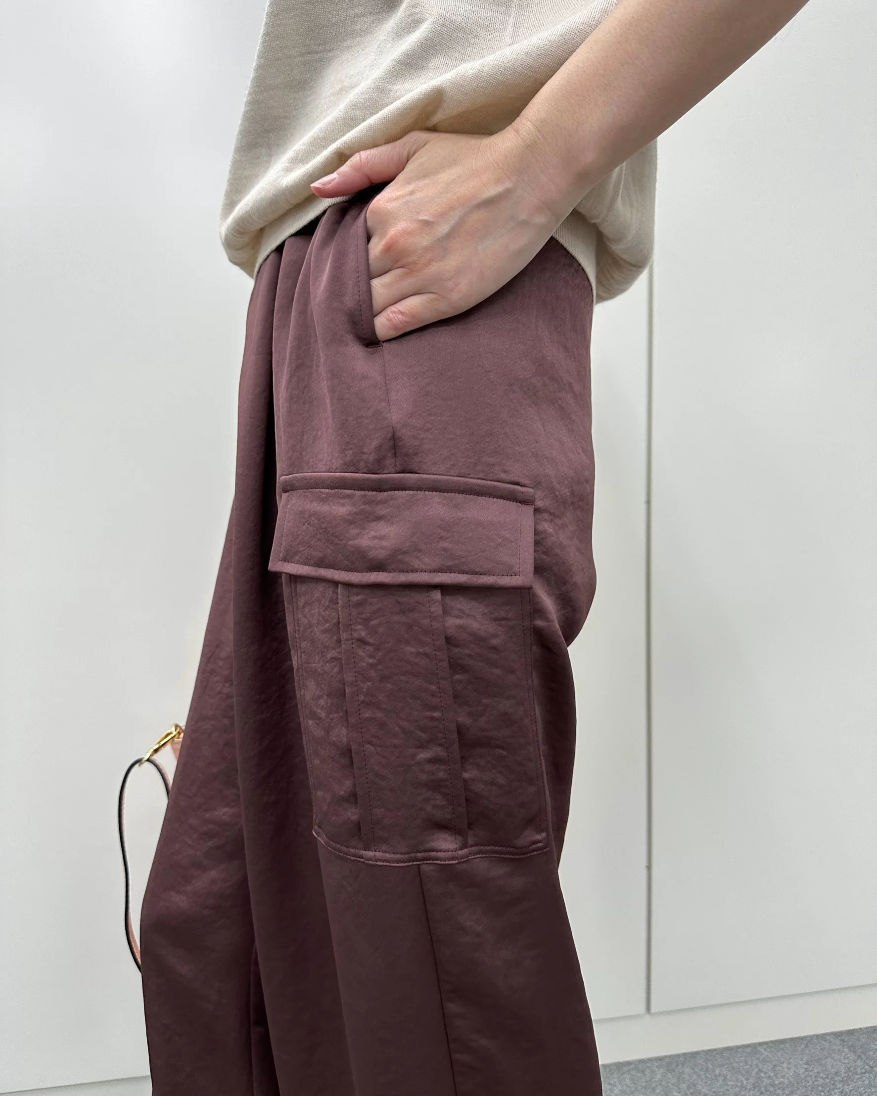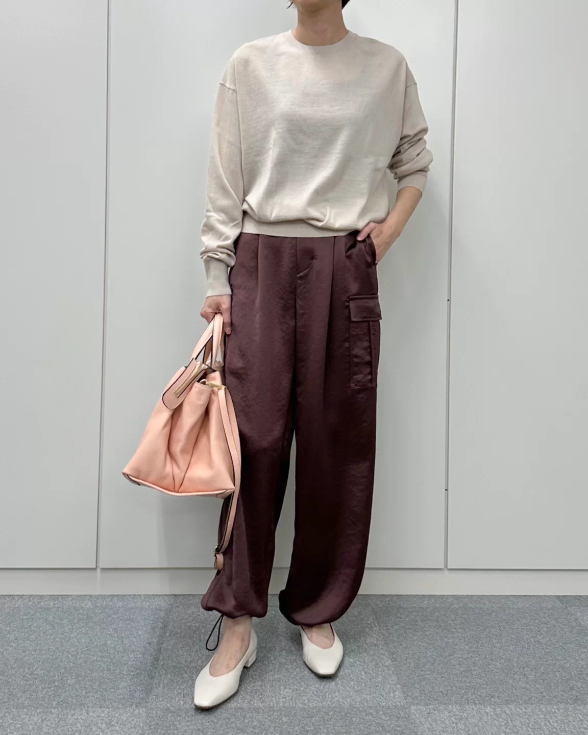 ヴィンテージ感のあるサテン生地を使い、カジュアル派はもちろん、きれいめ派にも大好評。ほどよいゆとりがありながら落ち感があるので、体のラインを拾わずにショート丈のトップスと合わせてもすっきりと着られる。ウエストは4分の3ゴムで着心地らくちん。ドローコードのすそで、調節が可能。