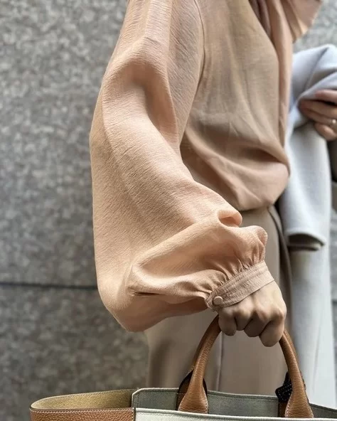 袖がポワンと膨らみ、細い手首の部分はキュッと締まるところも、ほんのり女らしくて素敵。バッグスタイルの一番上のボタンはスナップボタンで着脱しやすい。ボウタイは、はずしても着られます。