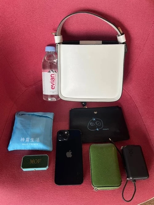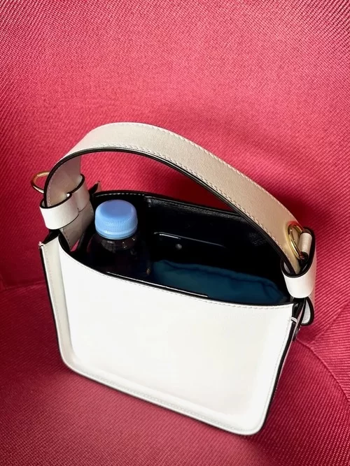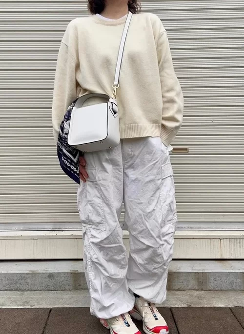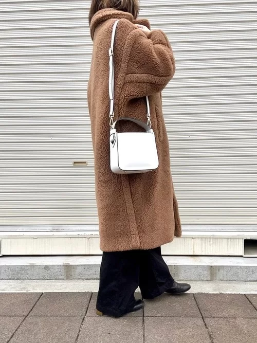 ダークカラーのアウターにも、このバッグのクリーンな白とスクエアなシェイプが加わることで、もたついた重めコーデがシャキッとする気が。いわゆる鮮やかな「差し色」ではないですが、十分にコーデのアクセントになってくれます。