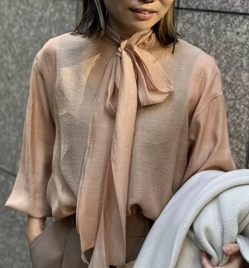 商品の制作進行中から気になっていたシアー素材のボウタイブラウス。フォーマルな時にも、カジュアルにデニム合わせても、使えそう!と思い購入しました。