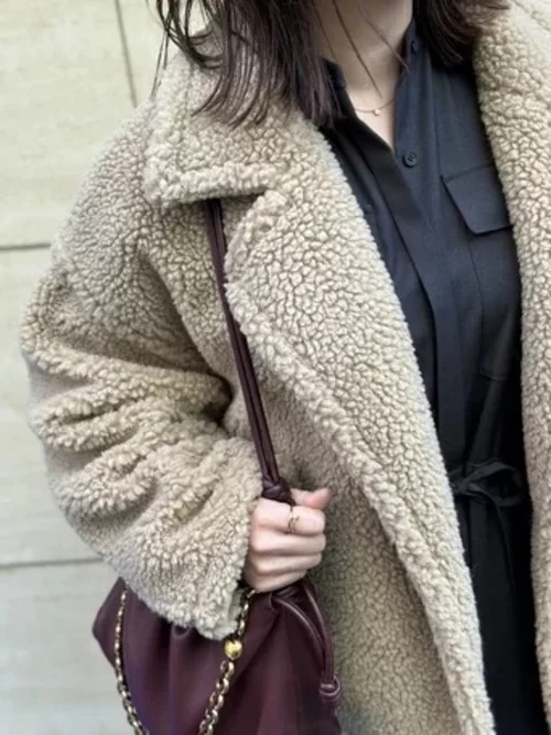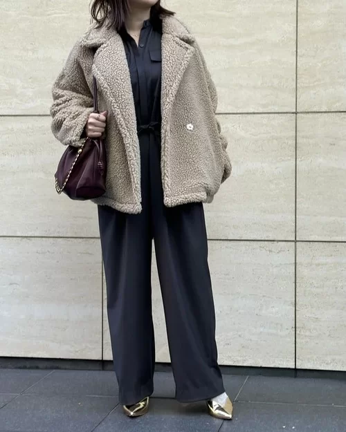 私が選ぶオールインワンの条件は必ず素材が上質であること。アイテム自体がカジュアルなので、素材はとても重要です。この日はボアアウターを合わせました。バンドカラーとチャコールグレーのかけ合わせで上品さを意識!