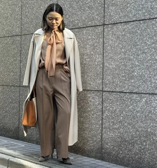 どうにも“リボン結び”が苦手なのですが(きれいに決まらない……)、こちらはザッとラフに結ぶだけでこなれて見えるので助かります。この日はワントーンに近いピンク~ベージュで、甘めのミルクティー色コーデ。ボウタイのリボンの存在がメリハリを生んでくれます。