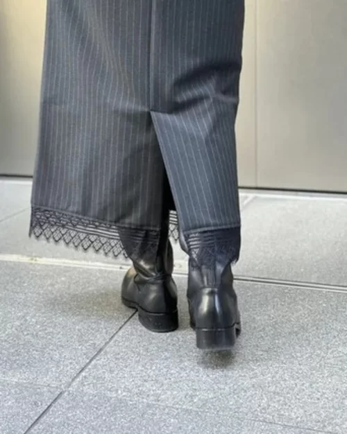 ピンストライプの素材に裾レースがあしらわれたハイブリットなデザインに一目ぼれ。ハンサムなピンストライプがコンサバにならず、モードな雰囲気に。また縦ラインが強調されてスタイルアップもかなえてくれます。体のラインを拾わない、つかず離れずのタイトシルエットも魅力的。