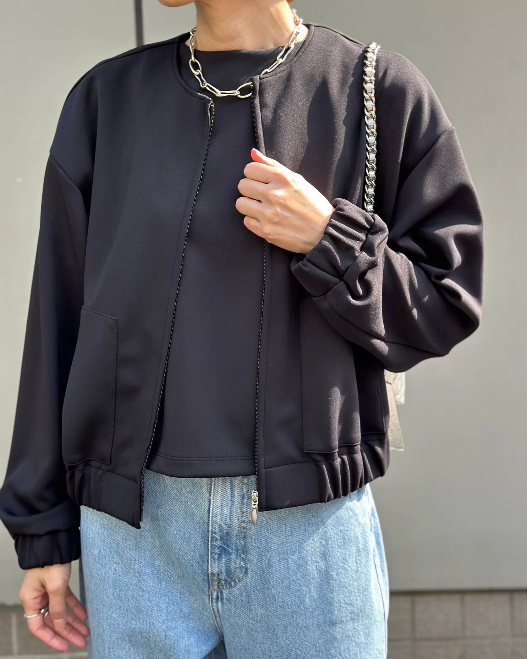 同素材のパンツと合わせてオールインワン風に。ウエストのくびれラインが美しいパンツだから、インして腰位置を高く見せて。ショート丈ならアウトするのがおすすめ。適度なハリ感がありながら軽くてシワになりにくい素材も魅力。