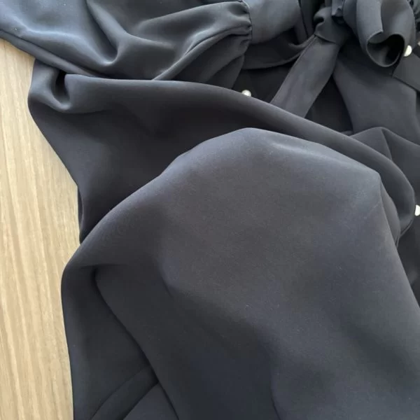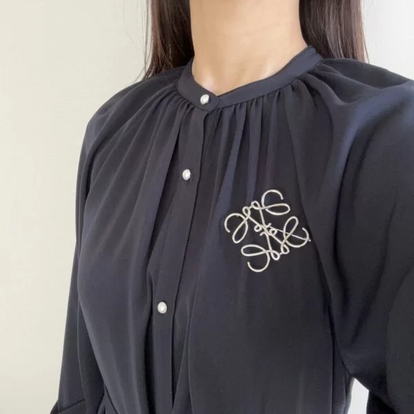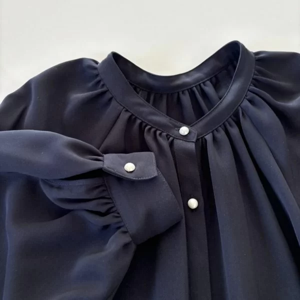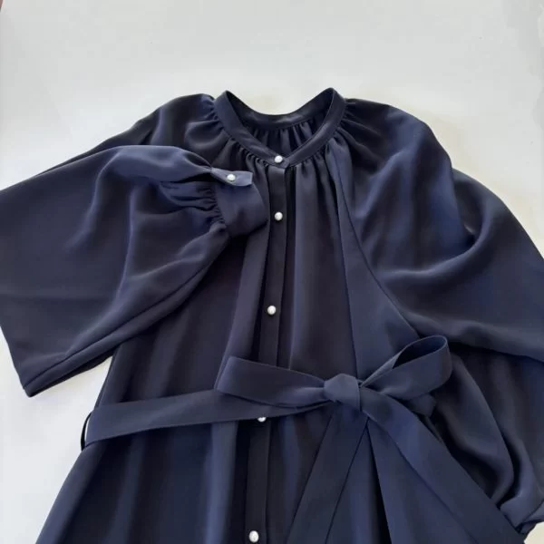 衿元や袖口のギャザー、共布リボンが配されたデザインが女性らしくて素敵♡