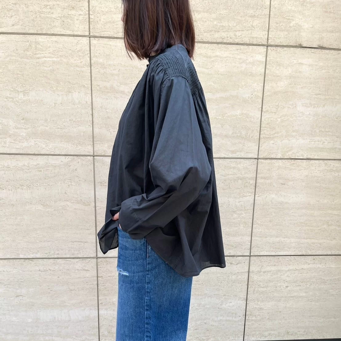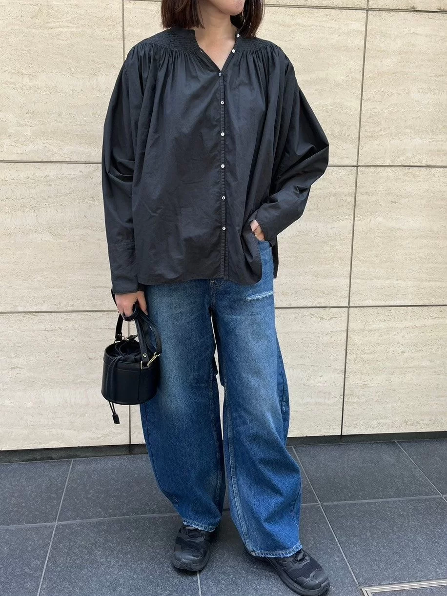 - 生地は細番手の糸で織られた、ソフトな肌触りと優しい透け感が特徴のコットンローン素材。肩まわりに寄せたギャザーの落ち感と、空気をはらんでふわっと広がる様子が小粋な、バンドカラーのシャツブラウスです。黒よりも柔和で、グレーよりソリッドなチャコールは、LEEだけの別注色。前ボタンの開閉によって印象が変わり、ばさっとはおっても絵に。