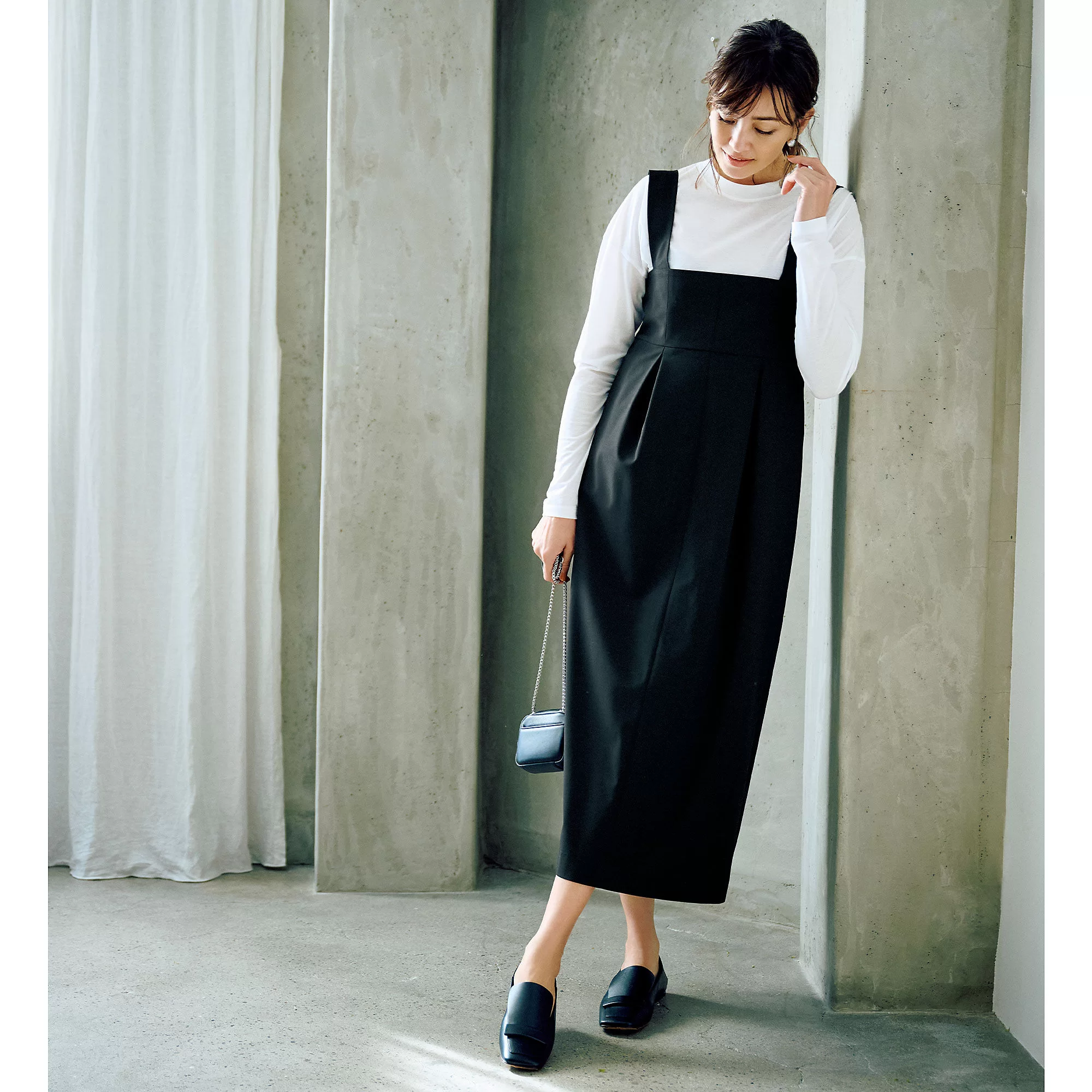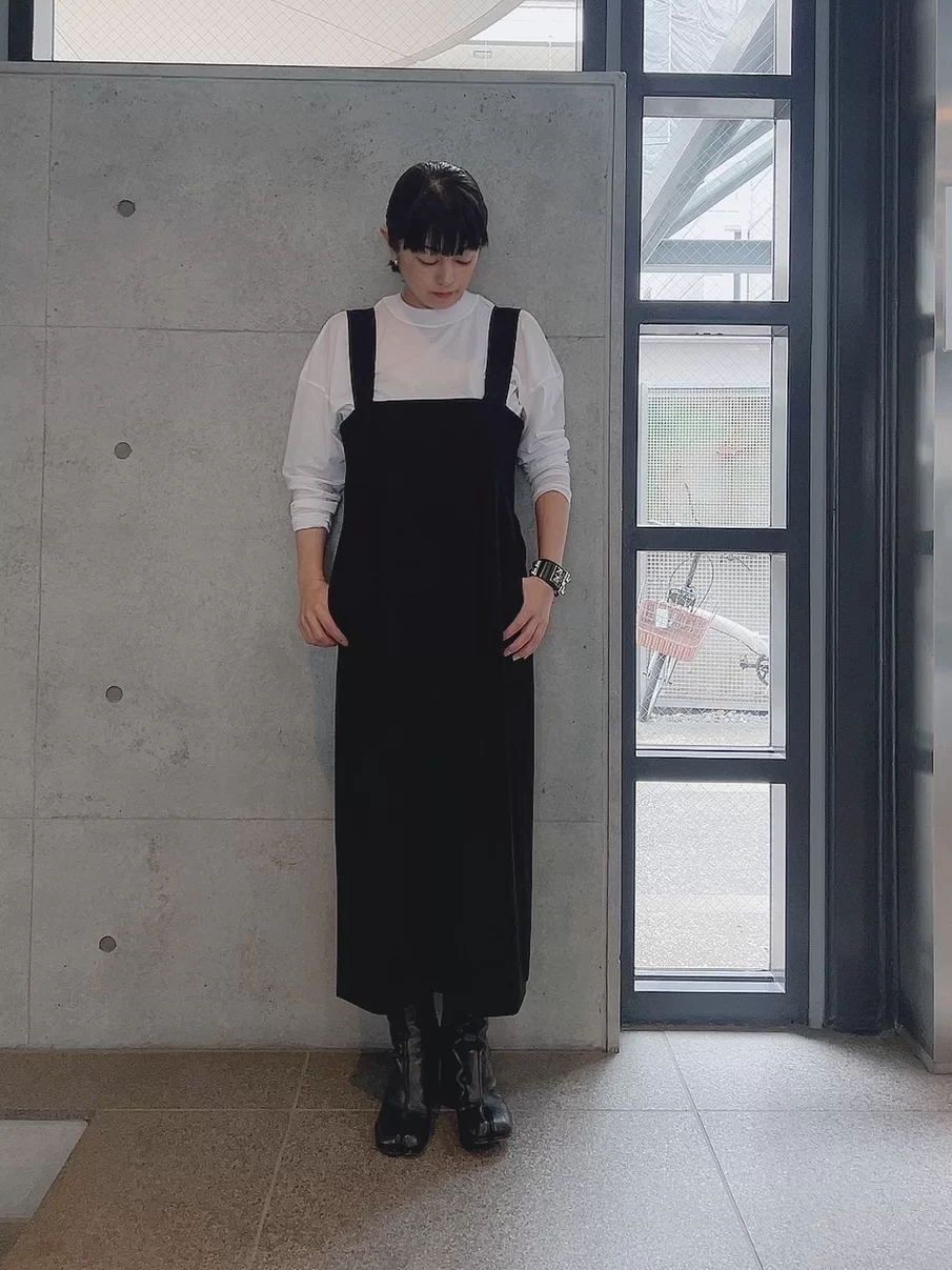今季はキャミワンピでレイヤードを楽しみたい気分。華奢な肩紐だと子供っぽくなるので、幅のあるストラップやコクーンシルエットなどほんのりモードに見えるディテールを厳選。         ”スタイリスト福田亜矢子さん”