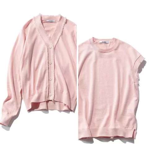 オーストラリアの厳選されたマイクロンウールの梳毛糸とコットンの撚糸を用い、14G天竺編みをフルファッションで丁寧に編み立てたカーディガン&フレンチスリーブクルーネック。甘すぎない上品なピンクは、HAPPY PLUSだけのスペシャル別注。