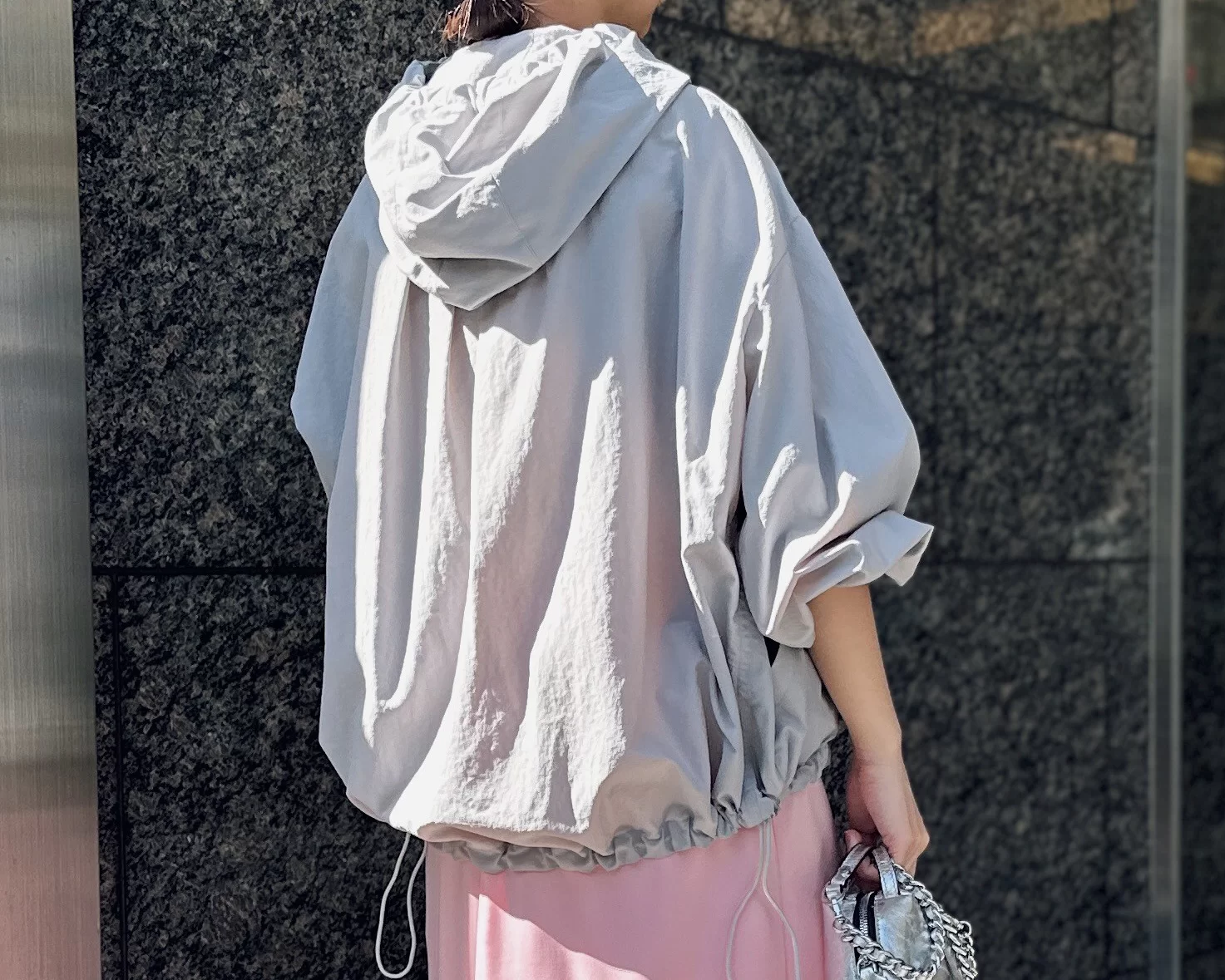 昨年春にヒットしたブルゾンに新色グレーが登場しました。スポーティーなシャカシャカ素材を使用したフーディブルゾン。高機能搭載で軽くてさらっと羽織っていただけるので、気温差のあるこの時期に活躍必至。コンパクトな丈設定で、スカートでもパンツでも決まりやすく、カーディガン感覚でたくさん着ていただけます。(MD.K)