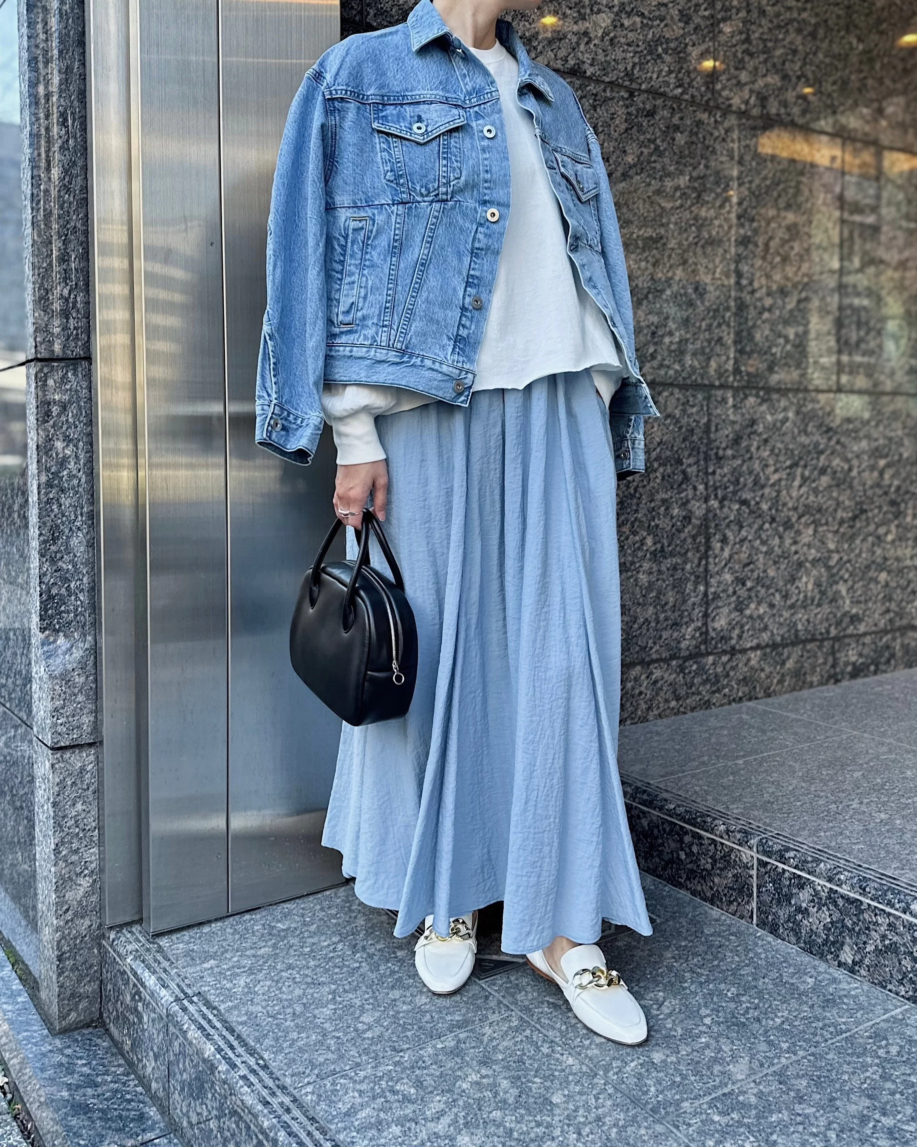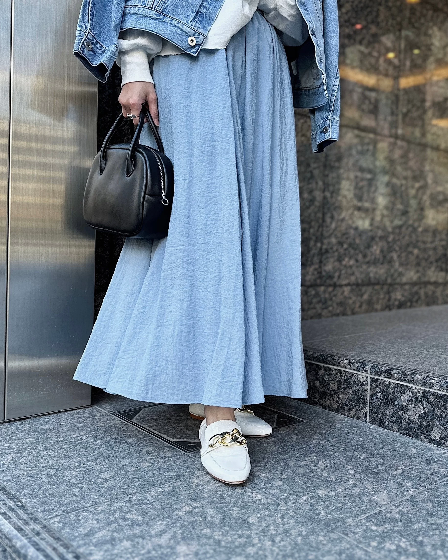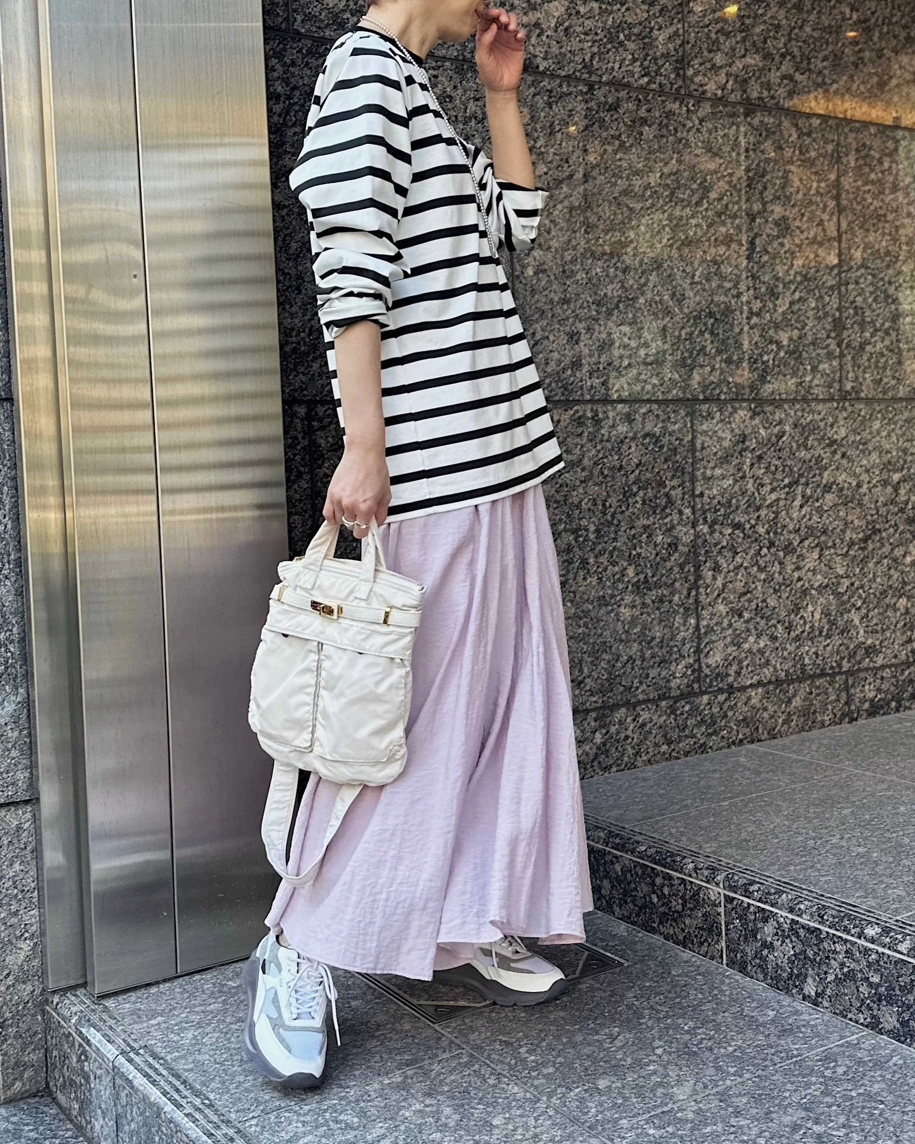 ナチュラルなワッシャー感のある素材がこなれ感を演出。シワが目立たないのもポイントです。