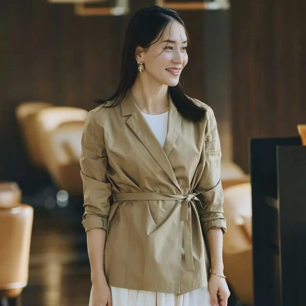 すっきりコンパクトな印象のシャツジャケット。さらっと羽織るだけできちんと感が出るテーラードタイプ。付属のベルトを使ってウエストマークしても素敵です。汎用性のあるアイテムなので、あると何かと重宝しますよ!