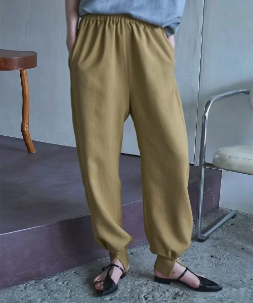 リネンが入っているような、梨地(梨の皮のような生地)風の素材。ジョガーなので着丈を気にする必要なく、低身長の方も高身長の方も安心して穿いていただけます。