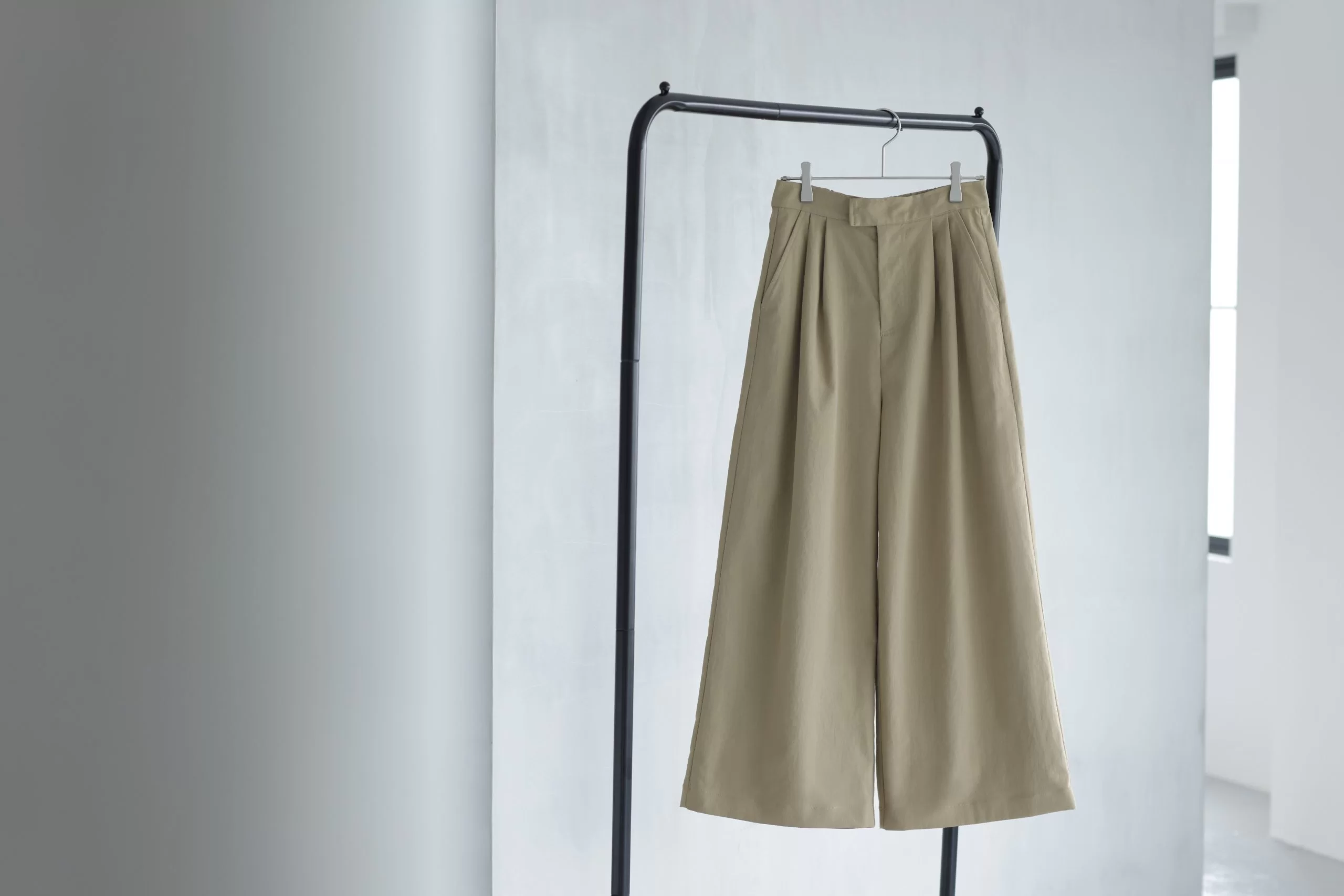 デニムシャツと同日発売の「ワイドチノパンツ」も今季デビューの自信作! 昨夏大好評を博した「楽ちんワイドタックパンツ」の形はそのままに、吸水速乾やUV防止といった高機能なチノ素材でアップデート。これまでのチノパンでは飽き足らないという方にこそ、ぜひとも試していただきたい一本です。