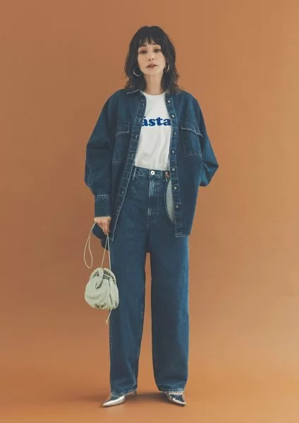 程よい加工感が今年らしいデニムシャツは、アウターとしても着られる優れもの!袖回りや身幅がたっぷりと取られているのでニットやスウェットにも難なく羽織れます。オーバーサイズですが、サイドには深めのスリットが入っているので小柄さんでも抜け感のある着こなしが叶います。ポケット付きなのも嬉しいポイント!より今年らしい着こなしをするならデニム×デニムがおすすめ◎