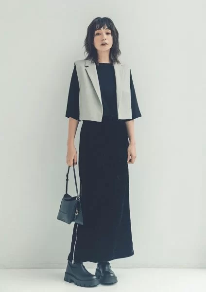 秋から冬にかけて、アウターを着るにはまだ早いけれど、何かもの足りない…という方におすすめしたいのが、ショート丈のジレ。細目のテーラード襟にクールなグレージュカラーというシャープさに対して、短めの丈でコンサバ過ぎないバランスに仕上がっています。コットンリネン素材なので、季節を問わず通年使えるのも嬉しい!端境期に持ってこいの1枚です。