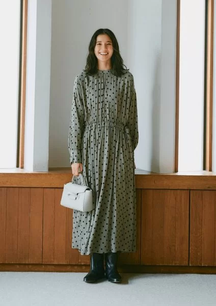 大きすぎず小さすぎない上品なドットが散りばめられた、SACRAの名品ワンピース。今季は新色のアッシュグリーンが登場!ドットと言えばブラック×ホワイトやネイビー×ホワイトがお決まりですが、優しげなニュアンスカラーに、ブラックのドットが映えたこちらのカラーも新鮮。合わせる小物のカラー次第で、キレイ目からフェミニンまで様々なスタイリングが楽しめますよ!