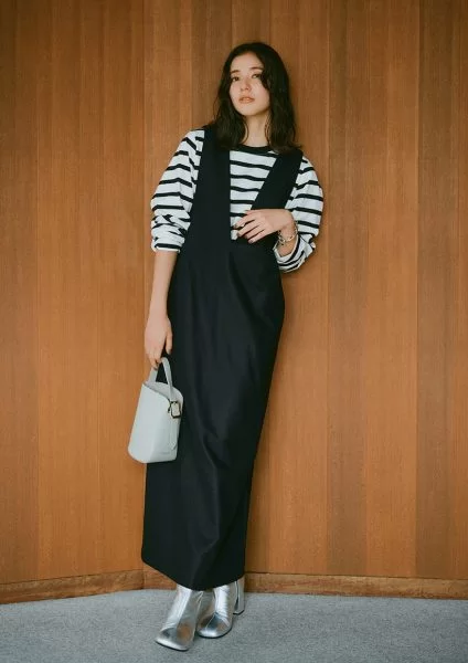 ぎゅっと詰まったハイカウントメルトンを使用したジャンパースカートは、真冬まで着られるあったか素材。上品なツヤがあり、ちゃんと見えもしながら、深めのVネックで上半身をすっきりと見せてくれる痩せ見え効果も!ニットやスウェットと合わせてももたつかないデザインで、汎用性抜群です。