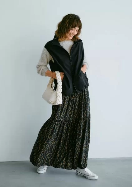 落ち感のあるティアードスカートに、今季のレオパード柄を載せてもらった別注スカート。華奢見えするIラインのシルエットと、スタイリングに馴染むシックなレオパ柄がこなれた雰囲気をプラスしてくれます。ベージュ、ブラウン、ネイビー、ブラックと多彩なカラーで表現されたSACRAならではの”大人顔”の柄アイテムです!同系色で合わせた着こなしはもちろん、カラーニットや起毛感のあるモヘアニットと合わせたスタイリングもおすすめ。