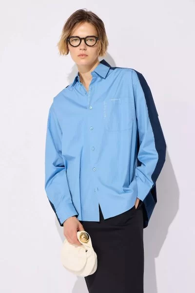 フロントはサックス、バックはネイビーと2色でパッキリと切り替えられたシャツ。シンプルに見えて、動いた時に鮮烈な印象を残します。ざっくりと着られるメンズライクなビッグシルエットに、左胸のポケットにひそかに添えられたブランド名のハンドステッチがポイント。