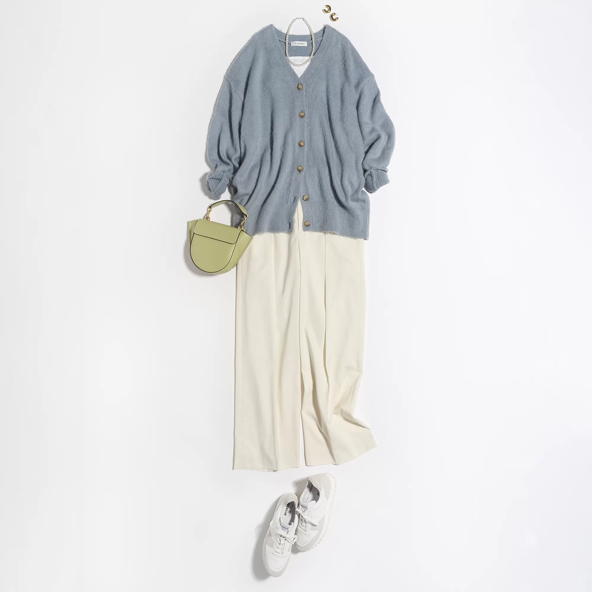 最高気温20℃の少し肌寒い日は、ふわふわニットがようやく着られるタイミング。キッドモヘア混の、ふんわりとした毛並みと風合いがポイント。あえて毛足を控えめにすることで、大人が日常使いしやすいデザインに。驚くほど軽くて着心地抜群。ボタンをとめて一枚でも、インナーにブラウスやタートルネックを入れてもバランスよく着られる縦長深めのVネック。暑いときは肩巻きしてもOK。
