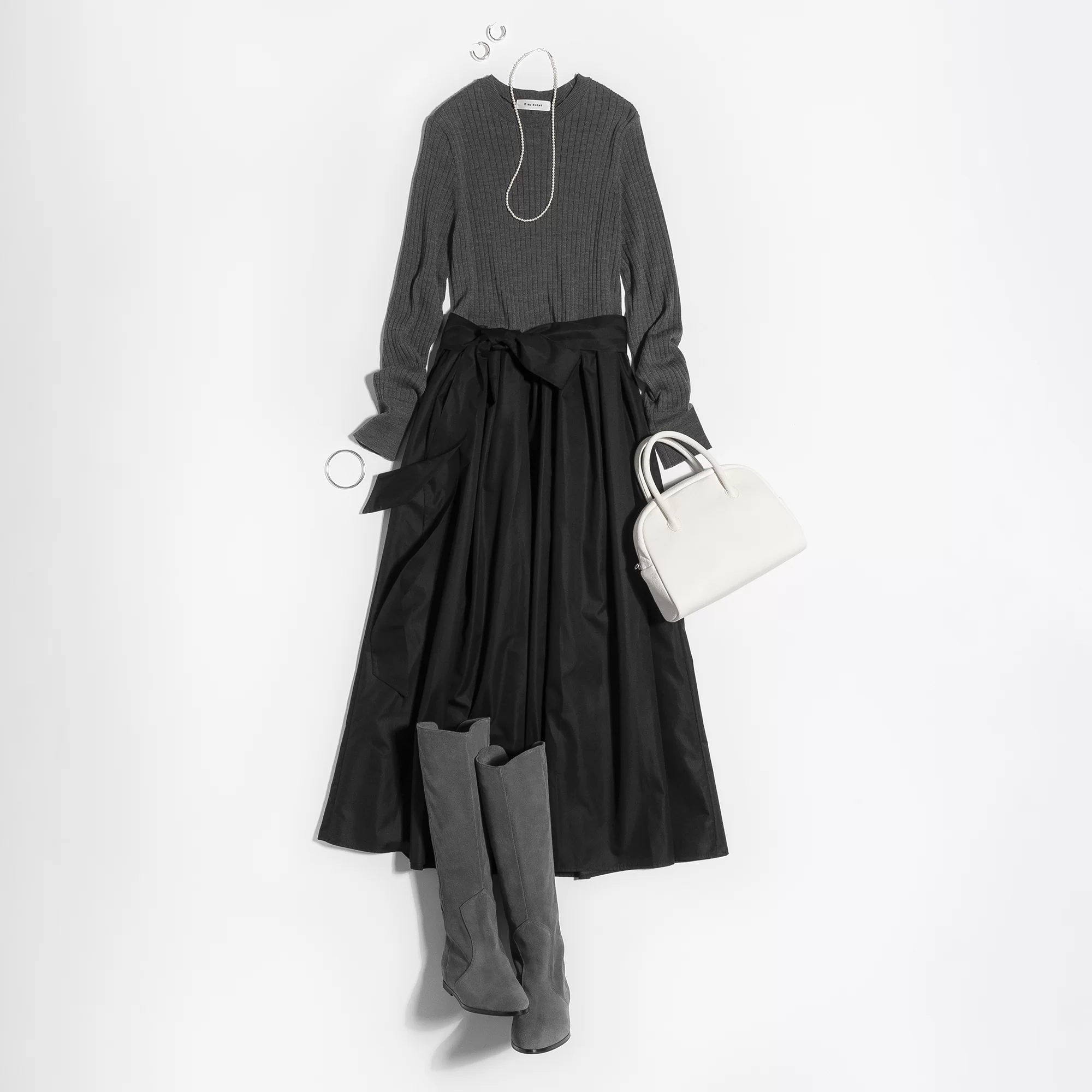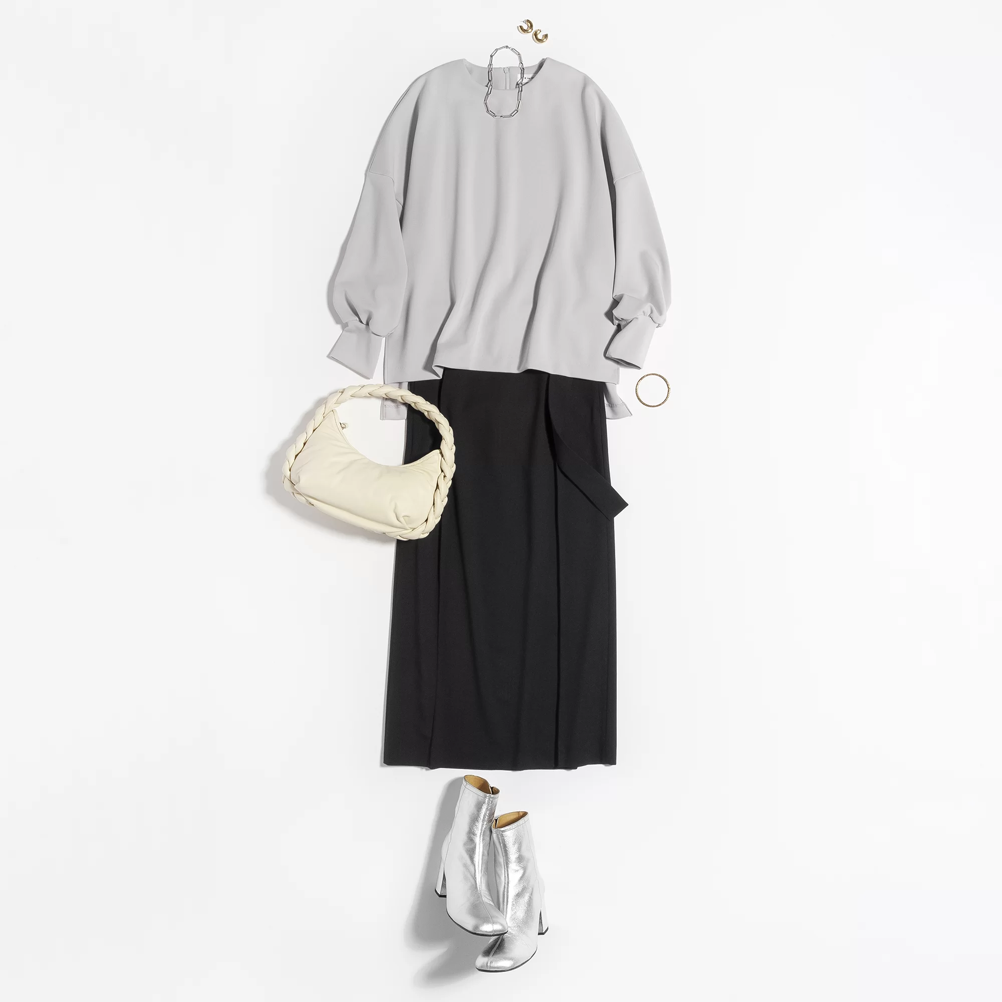ほどよいゆとりのドルマンスリーブシルエット。肌に密着しないから気温25度くらいでも心地よい。着丈に前後差を付けることで、ウエストアウトもインも決まるように計算。上質なウール混カットソー素材だから、カジュアルになりすぎず、身頃センターの切り替えもアクセントに。