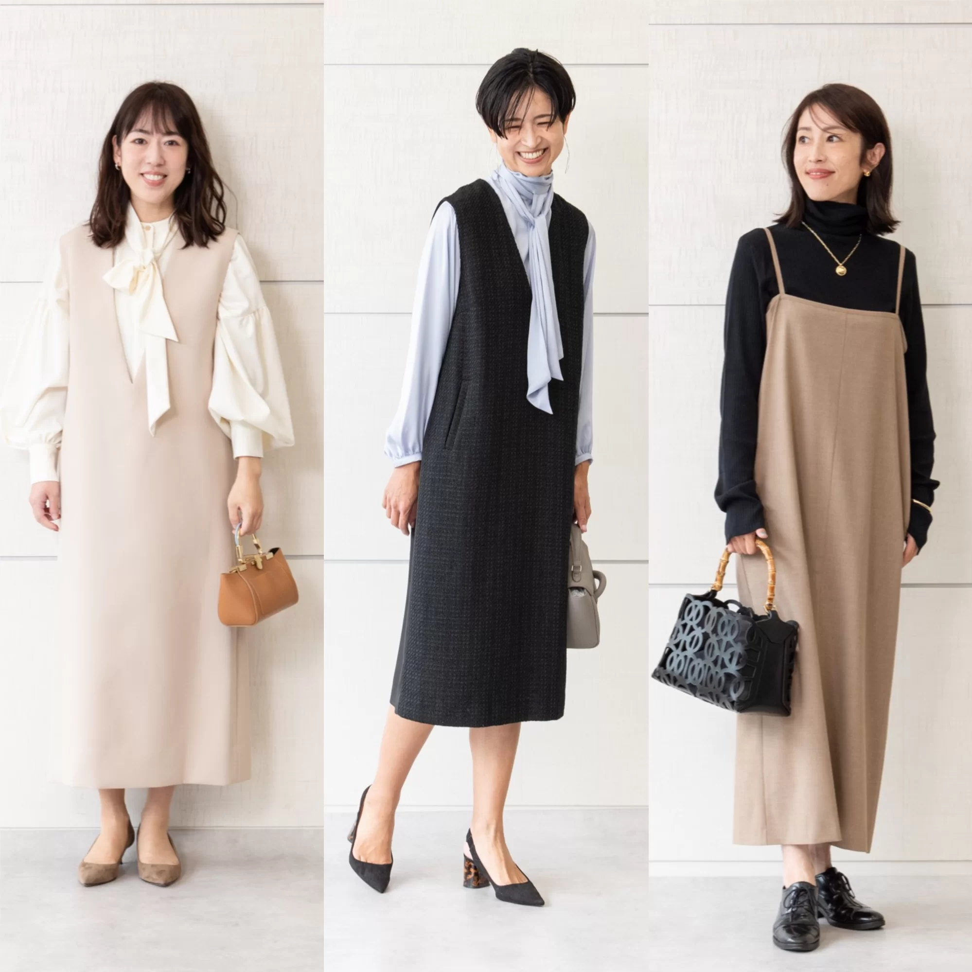 今やすっかり定番になったジャンパースカート。着るだけでコーデが決まる反面、マンネリしがち……。そこで、40代にこの秋おすすめしたいジャンパースカートで着回しを敢行!3つのアイテムを美女組さんに着てもらいました。