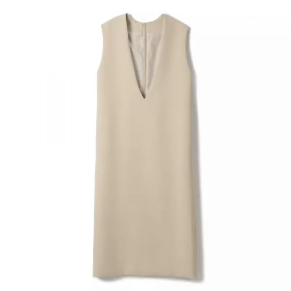 縦に深く入ったシャープなVネックのおかげでインナー次第でさまざまな着こなしが楽しめる。しゃれ感がありながら体形カバーをしてくれる体につかず離れずの絶妙なラインも秀逸。背面の高めの位置に入ったタックで腰高&脚長効果も。