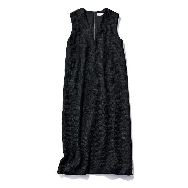 前面はリュクスなミックスツイード、背面は光沢感のあるサテン生地と、前後で表情が異なる上品なジャンパースカート。胸もとのVネックが上半身をすっきりきれいに見せてくれる。着るだけで、仕事にもおでかけのシーンにも似合う上品な印象に。
