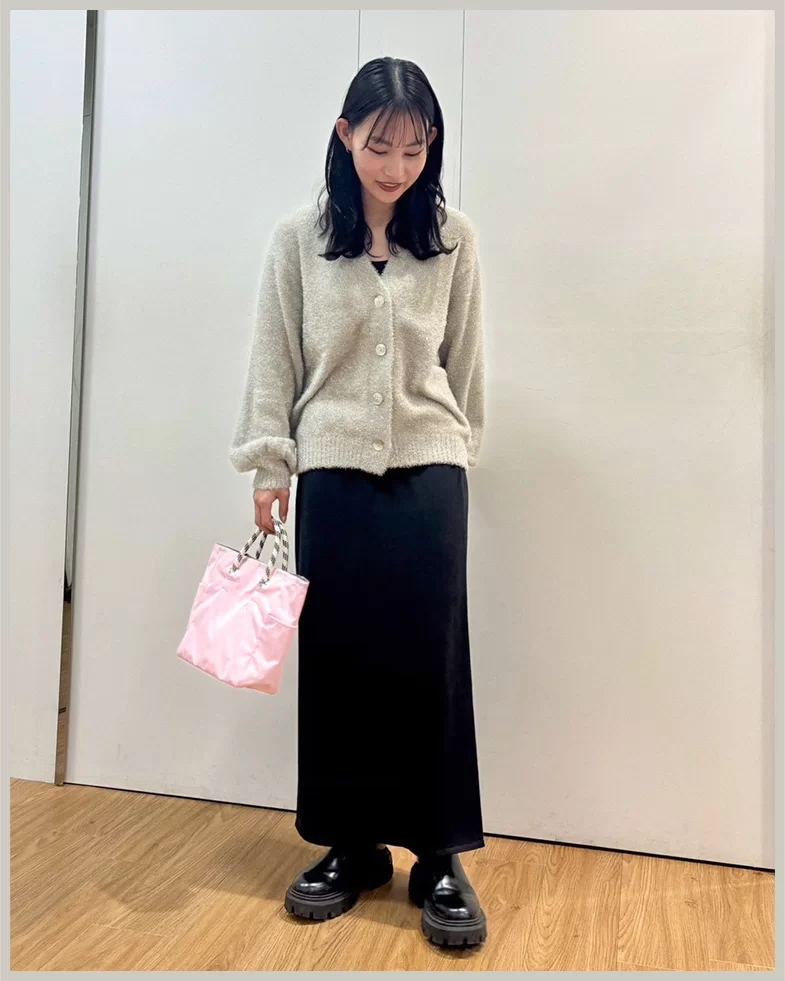 ふんわりとした優しい毛羽感が上品さと繊細さを表現し、大人っぽいシャギーニットが完成。華やかな素材感のため、ボタンは本体と同色、かつ小さめを選び、ミニマルに仕上げました。同素材の半袖プルオーバーと合わせてアンサンブルで着用するのもおすすめです。