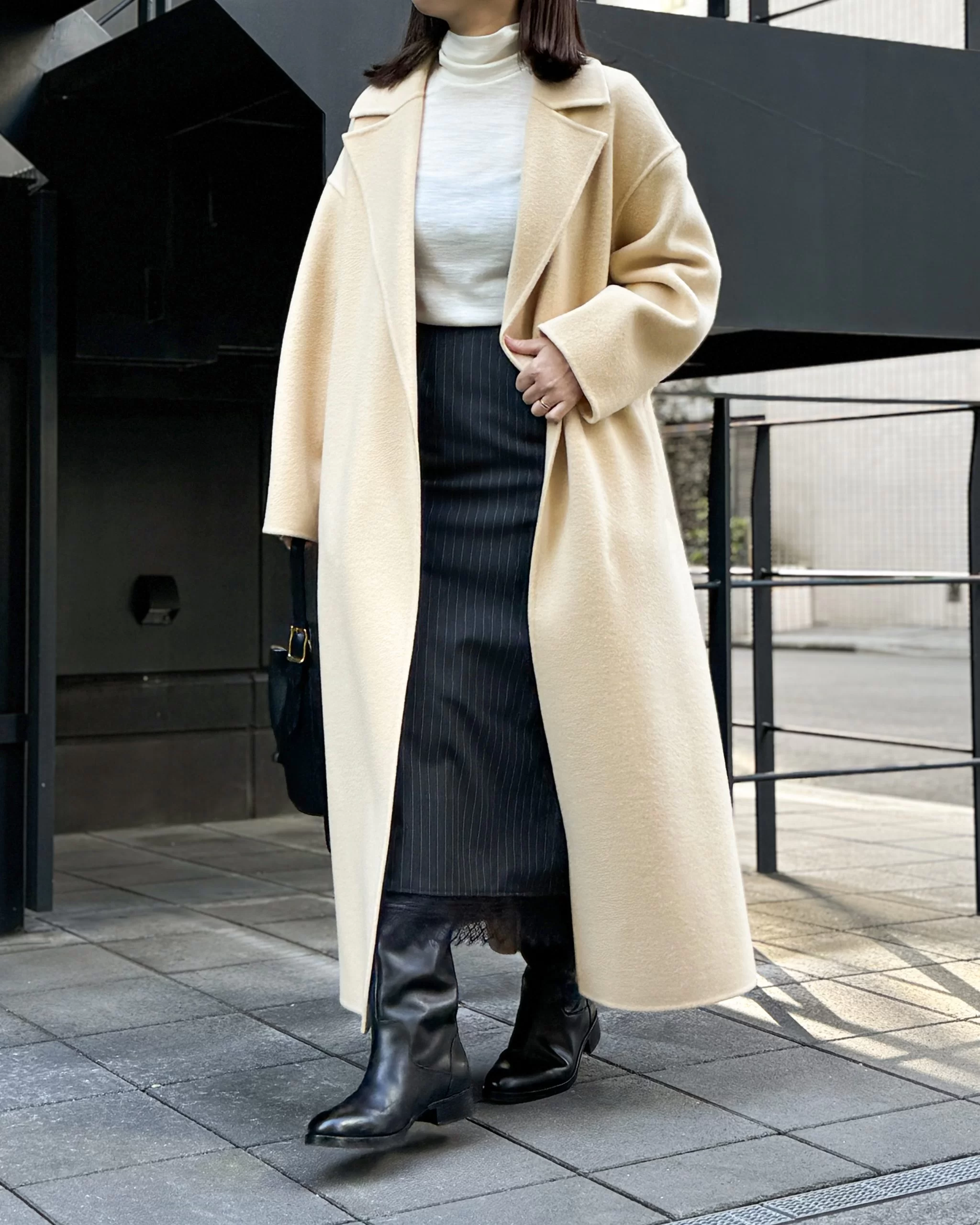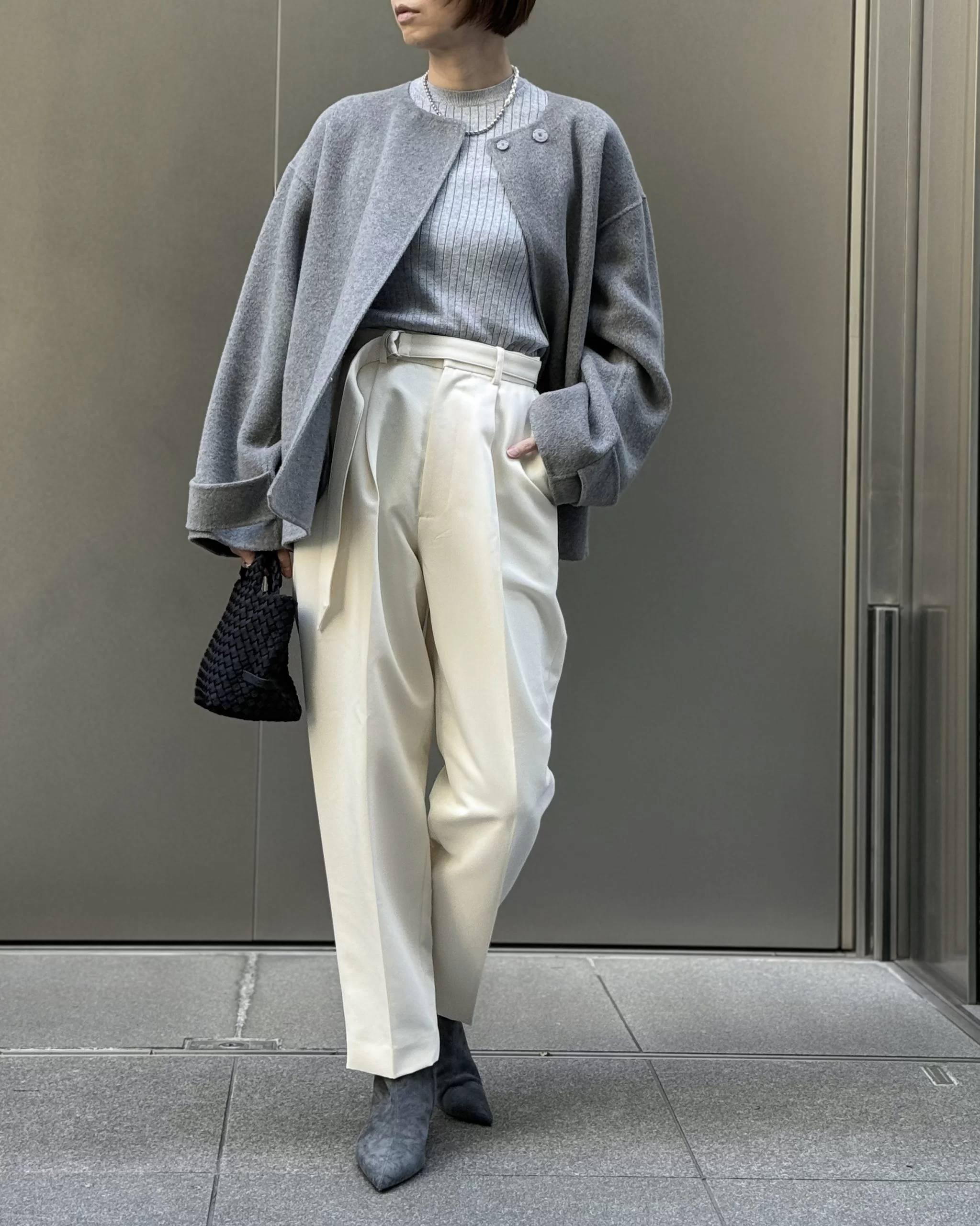 メンズスーツに使われるようなチャコールグレー地にストライプが施された素材は、縦横にストレッチがきいているので立ったり座ったりを繰り返してもシワになりにくく、窮屈感もなし。すそからちらっと見えるレースで女らしさをプラス。