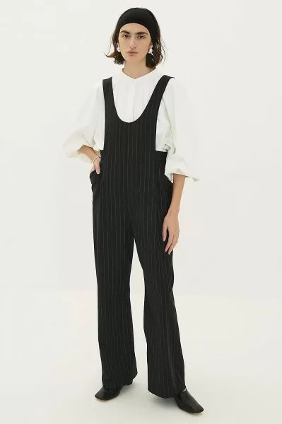 トレンドアイテムではあるけれど、大人には意外に難しいのが「サロペット」。「着太りしそう」「子供っぽくなりそう」……そんな懸念ポイントをすべてクリアした、まさに大人のための新作がこちら。ネイビーベースのピンストライプはハンサムな印象、かつ縦ラインを強調する視覚効果も。深くカットしたUネックで大人っぽく、トップスとの重ね着も楽しめます。