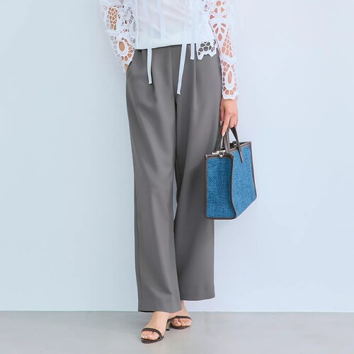 スーツ地のようなきれいな見た目にジャージーのような伸縮性を再現した、はき心地にこだわった素材を使用。なめらかな表面感、かつウエストゴム仕様ながらタック入りなので、コーディネート次第でオンオフどちらにも着まわせる。撚糸による清涼感があり、暑い夏もさらっと着こなせる。シワにもなりづらいので座り時間の長いビジネスシーンにも活躍。