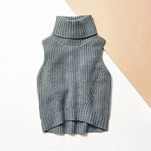 ボリュームのあるタートル、ゆるっと立体的なフォルムと丈感、ざっくりとしたあぜ編みのかわいさ、ノースリーブの抜け感がマッチしたほかにはないデザイン。秋冬のレイヤードスタイルの主役にぴったり!