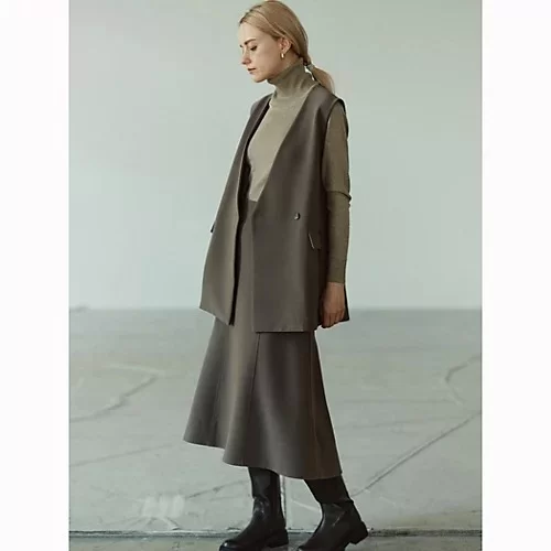 ポリエステル混でシワにもなりにくく型崩れもしにくい万能素材です。春夏でも好評だったジレを敢えて梳毛素材で作ることでマニッシュな印象に落とし込んでいます。ボウタイやビックカラーのブラウスなどフェミニンなアイテムとも好相性。