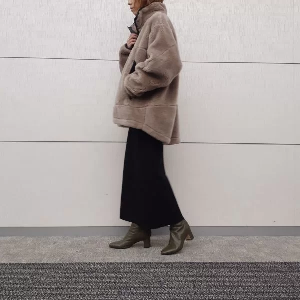 もこもこボリュームアウターとタイトスカートの組み合わせが
