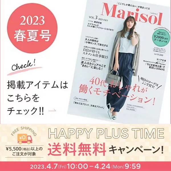 4/30(日)までにMarisol本誌を最寄りのHAPPY PLUS各店舗にお持ちいただくと、店舗でのお買いものに使える¥1,000オフクーポンをプレゼント!※税込み11,000円以上のお買いものでお一人様1回限りのご利用とさせていただきます。
