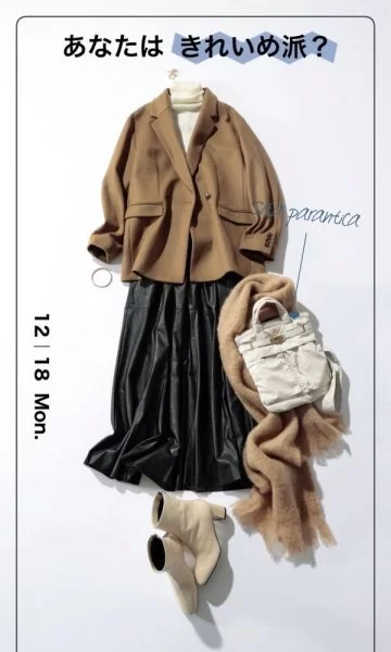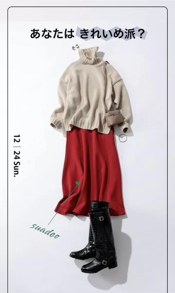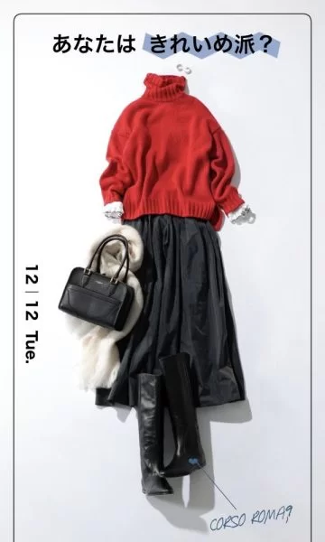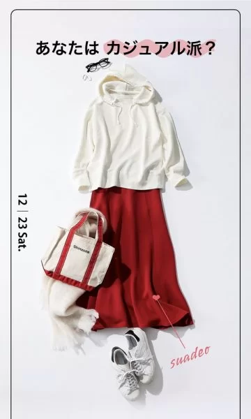 ハリとドレープが美しいフレアスカートは、手にしただけでウキウキした気分になれる赤。カジュアル派にとっての定番、パ―カやスニーカーを白に変えるだけでいつものコーデが特別な着こなしに早変わり!