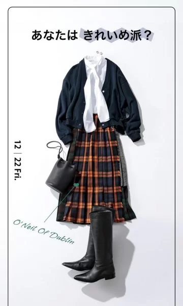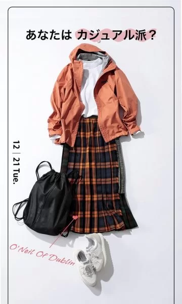 グンと冷えた日は、履くだけで元気がチャージできるチェックのスカートをチョイス! 柄の中のオレンジカラーに合わせたマウンパをはおれば、暗くなりがちな冬の着こなしを明るく演出。冬のスポーツ観戦にもぴったり。