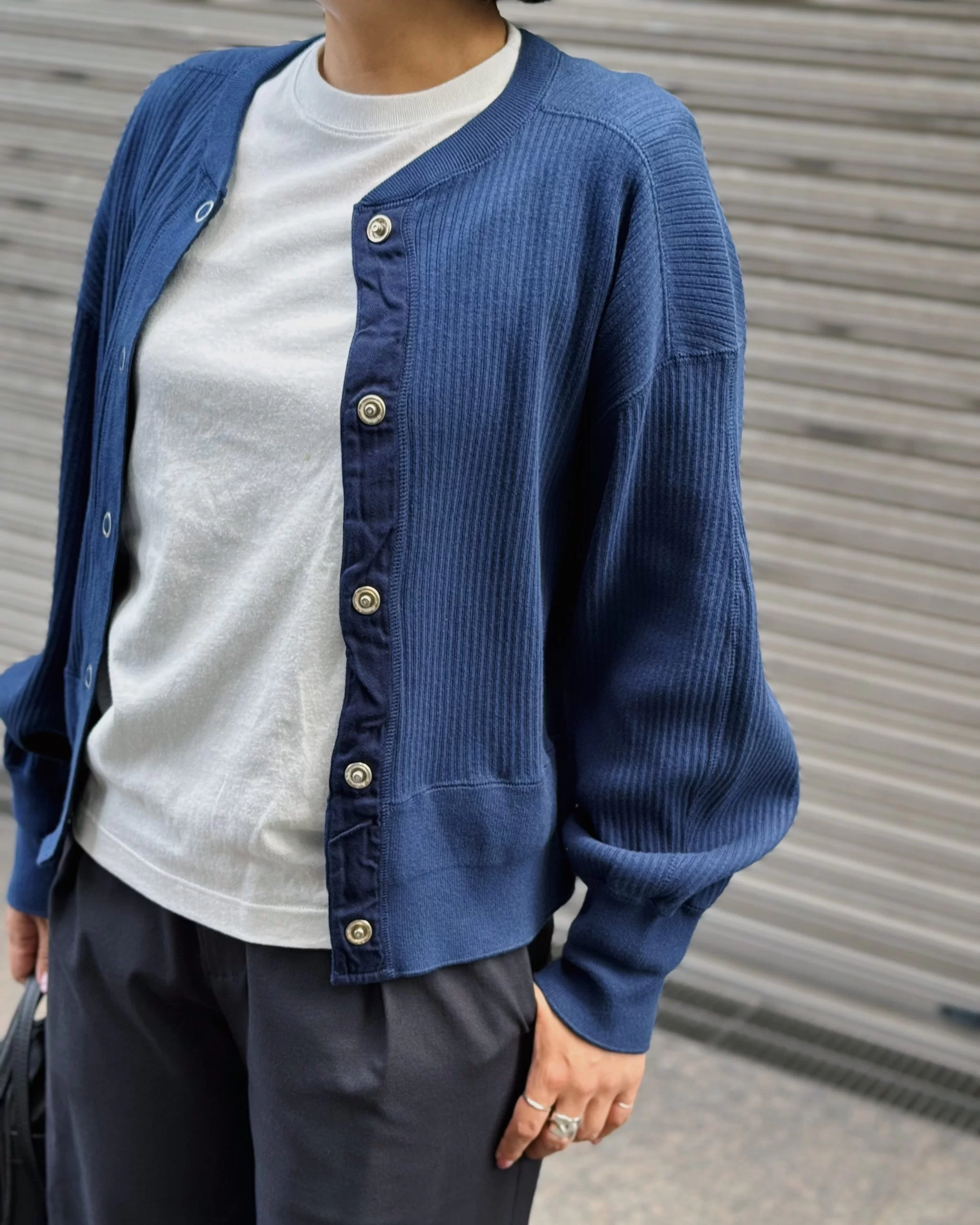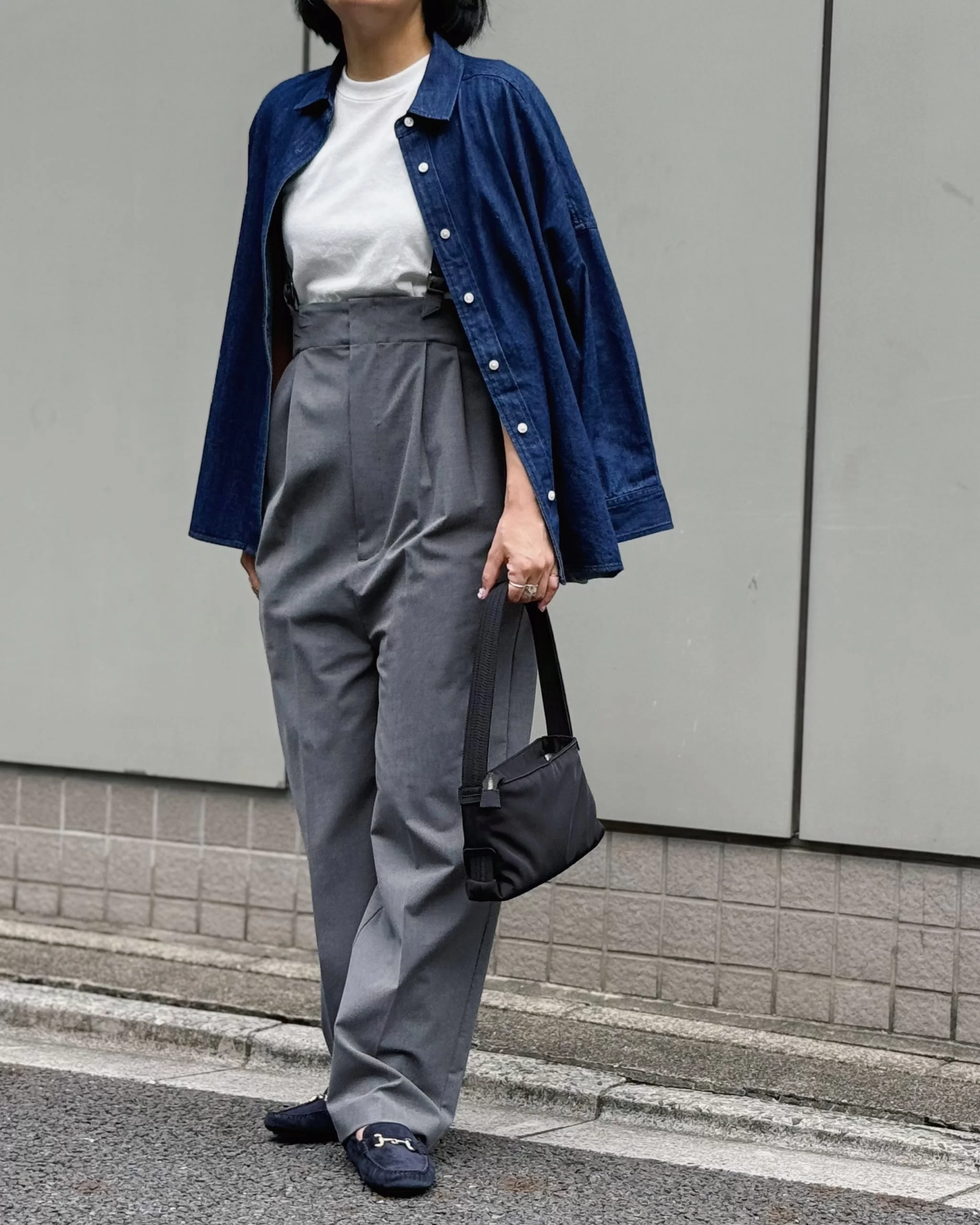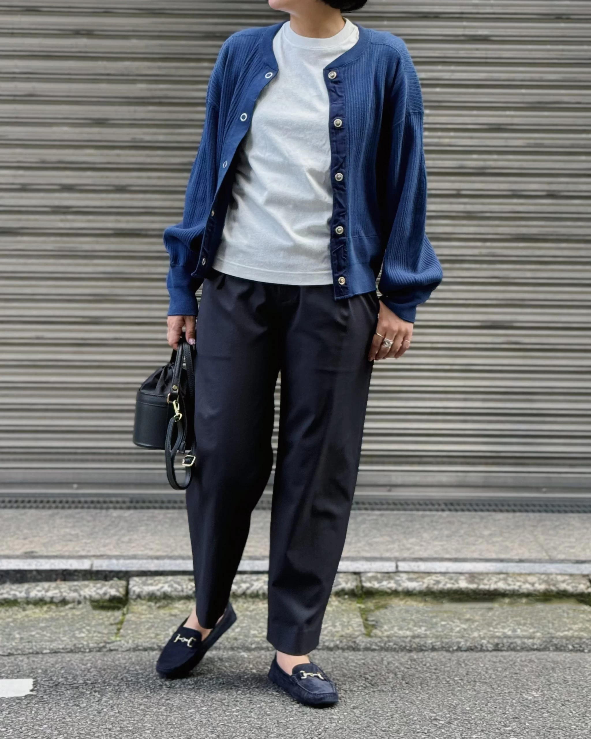 「パンツはストレッチ入りではきごこち良く、シワになりにくいのも魅力。夏はTシャツとサンダルに合わせていましたが、ローファーやレザーバッグの秋小物を合わせてトラッドに着こなしたい。ブルーのカーディガンを差し色に。」