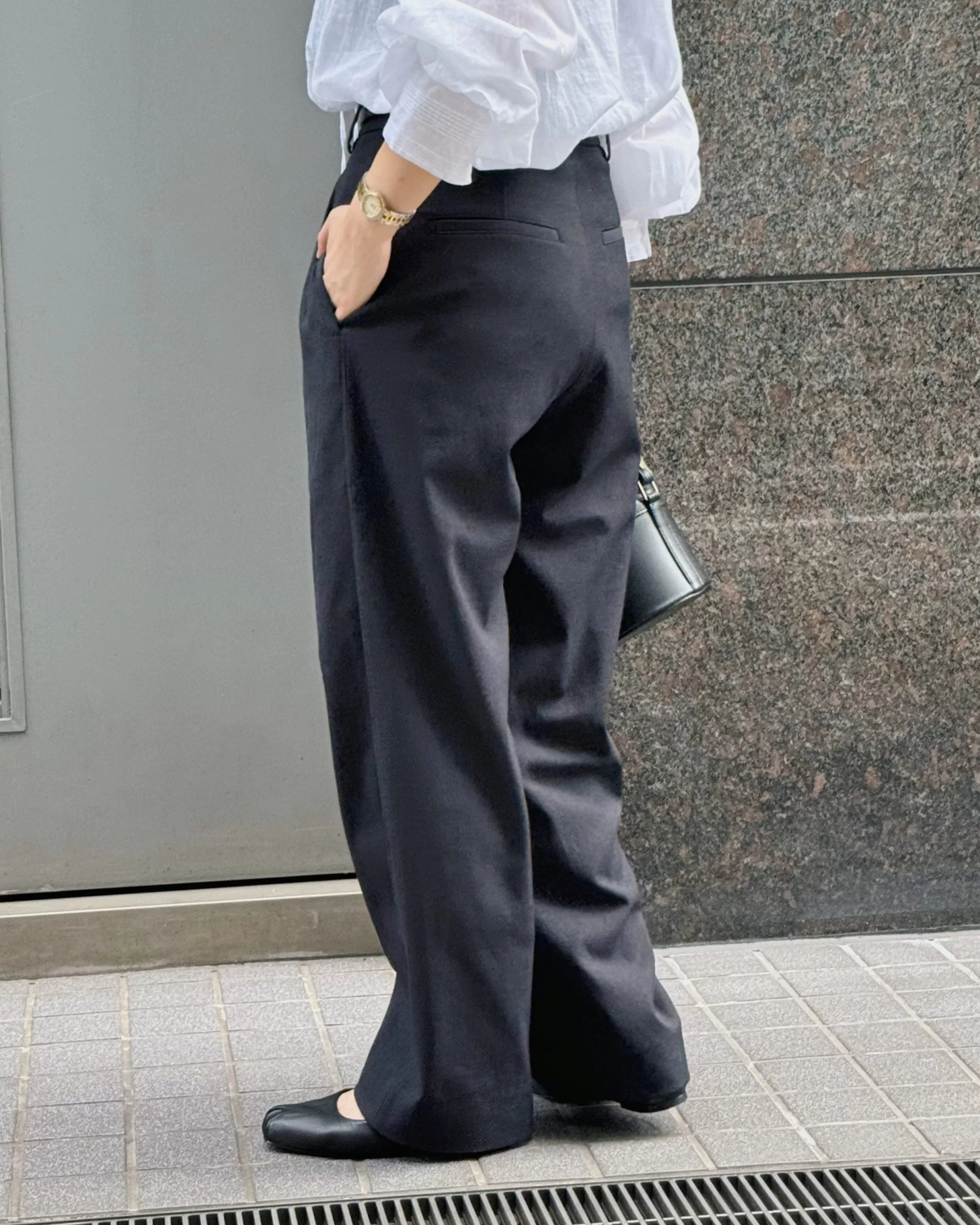 「秋コーデに合わせやすい、ダークネイビーのパンツ。太すぎないカーブシルエットが気になる下半身をすっぽりカバーし、横顔もスマート。甘めなブラウスをネイビーのパンツでかっこよくまとめました。」