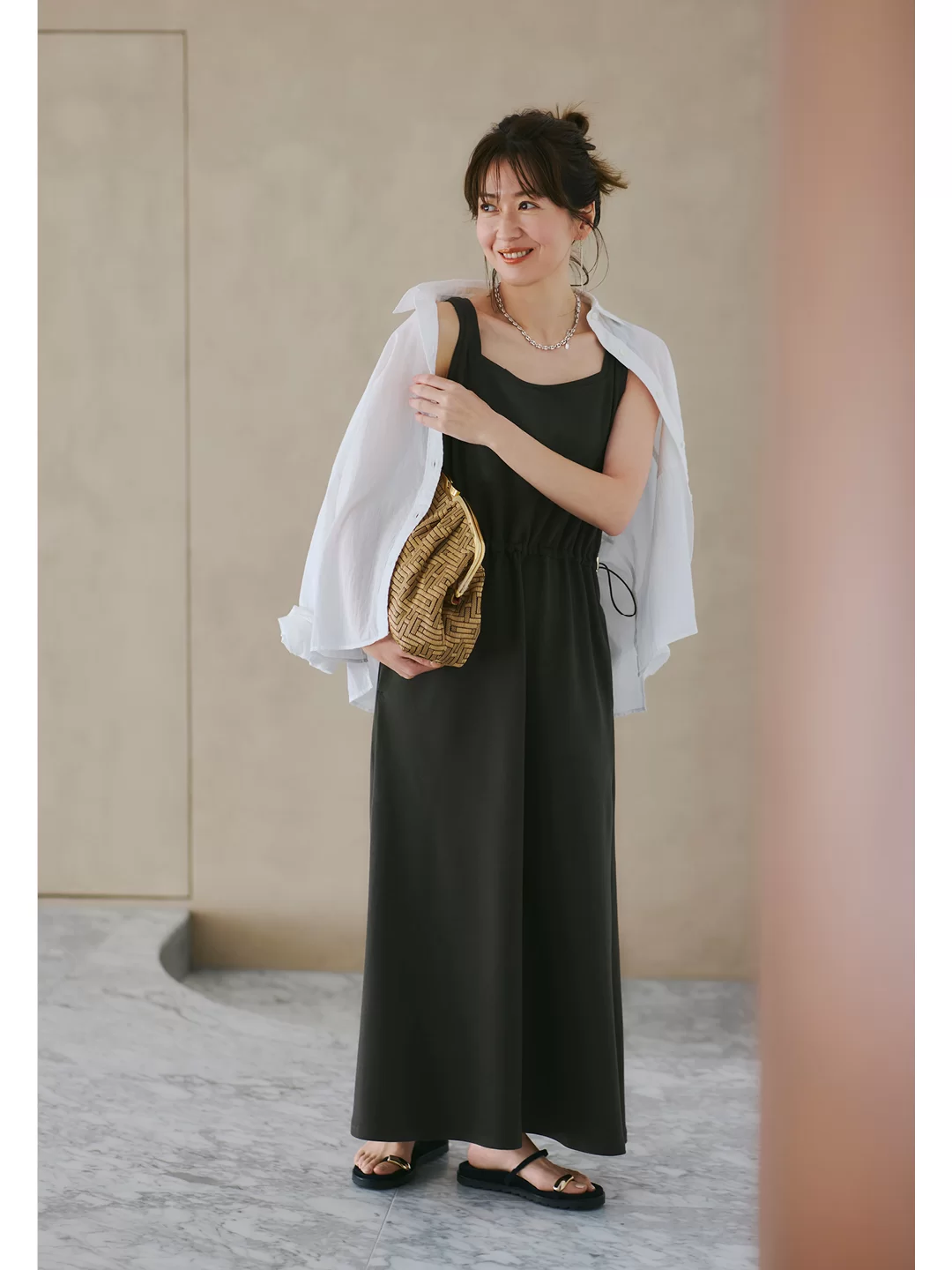 昨年6月号でカデュネと作らせていただいたメッシュニット。前回はタンクとセットで発売しましたが、実は昨夏、露出の高いキャミワンピなどを着る時にもはおりとしてとても重宝したので、その経験を踏まえ、今年はワンピースとのセットで別注しました。ニットの素材や基本の形は一緒ですが、昨年とは違った印象で楽しめるように新色の黒とベージュに。そしてワンピースは黒ニットにはカーキ、ベージュニットには黒とセットで着た時におしゃれに仕上がるベストな色を選びました。それぞれ単品でも使いやすい工夫を凝らしているので、ぜひ幅広いシーンに着ていただきたいです。