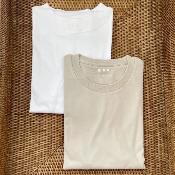 本来はネック違いの白2枚組だったのを、モックネックの白とラウンドネックのグレージュで作られました。