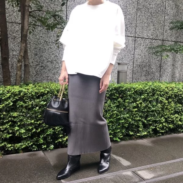 厚みのあるリブ編みで秋から冬までたくさん履ける素材を使用。細目のリブなのでスッキリ縦長のラインが出て体をきれいにみせてくれます。ラクちんながらも体のラインを拾わないデザインに。