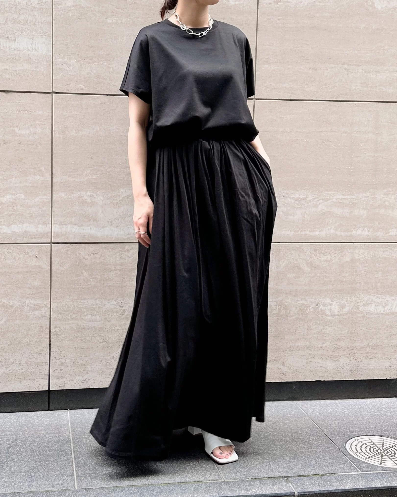 リラックス感があるのに、艶のある表面や、きれいなドレープが出る素材感が上品!トップスは、Tシャツ以上ブラウス未満な感覚できちんと見えするので、お仕事にもぴったり。