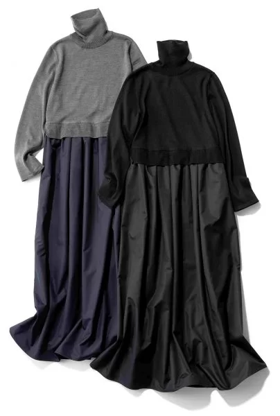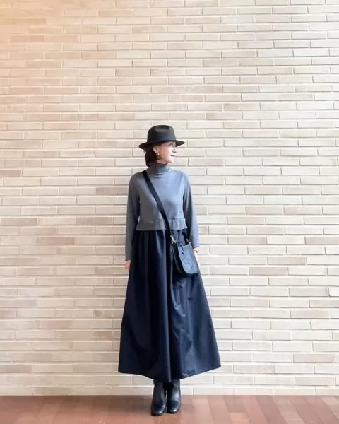 ニットとスカートをコーデしているように見えて実はワンピースという楽ちんなのにかわいく決まる大活躍間違い無しの優秀ワンピース