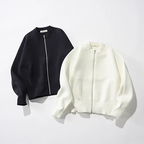 上質感漂うミラノリブ素材を贅沢に使用したニットブルゾン。リラクシーな着心地ながら、ほどよい張り感で上半身をシャープに見せ、旬のフォルムを演出。シルバーのジップが上質なアクセントになり、オンオフ問わず活躍してくれる一着だ。