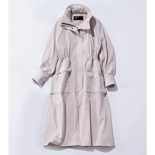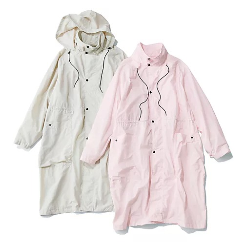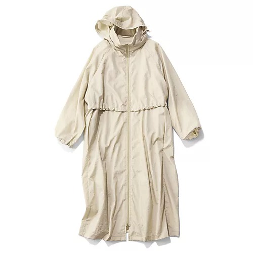 シアー感のあるアイボリー色が魅力的な超軽量コート。襟のコンシールファスナーポケット部分に収納できるフードや、ウエストのドローコードで好みのシルエットを楽しめるのもうれしいポイント。